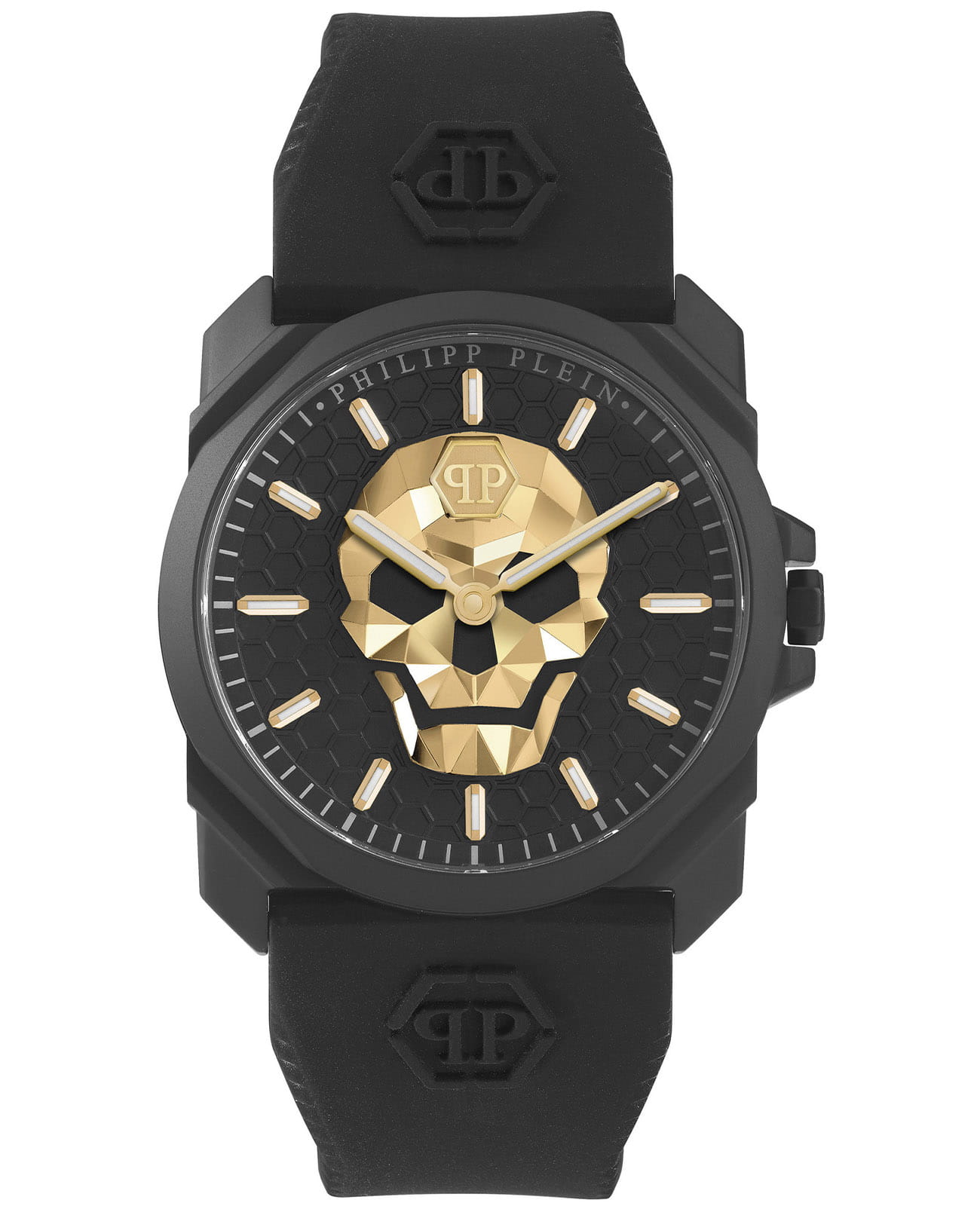 Мужские кварцевые часы с фирменным изображением черепа Philipp Plein The Skull King PWLAA0322, кварцевый механизм с высокой точностью. Класс водозащиты: 50 метров, позволит защитить корпус от случайных брызг или капель дождя. Корпус часов изготовлен из стали с IP-покрытиемIP-покрытиеМетод ионного напыления. Демонстрирует повышенную устойчивость к истиранию, окислению и химическим веществам. Под воздействием высокого давления и температуры около 1500°C молекулы металла надёжно соединяются с частицами корпуса часов. черного цвета. Черный силиконовый ремешок шириной 26 мм, стандартная застежка. Прочное минеральное стеклоМинеральное стеклоМинеральное стекло представляет собой искусственно выращенный минерал кварца. Такое стекло отличается особой устойчивостью к повреждениям и царапинам. Уступает по некоторым качествам сапфировому стеклу. устойчивое к мелким механическим повреждениям.