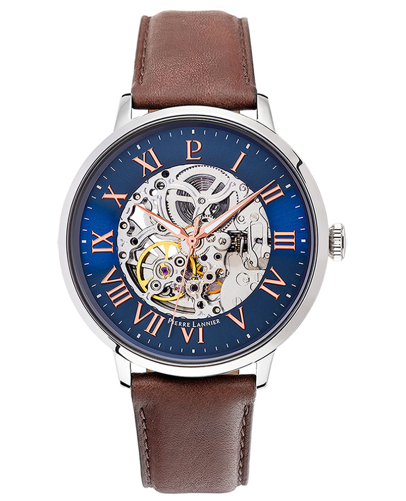 Мужские механические часы с автоподзаводом Pierre Lannier Automatic 322B164. Минеральное стеклоМинеральное стеклоМинеральное стекло представляет собой искусственно выращенный минерал кварца. Такое стекло отличается особой устойчивостью к повреждениям и царапинам. Уступает по некоторым качествам сапфировому стеклу. устойчивое к мелким механическим повреждениям. Скелетонизированный циферблат. Центральные часовая, минутная и секундная стрелки. Стрелки с люминесцентным покрытиемЛюминесцентное покрытиеПозволяет считывать показания времени в темноте. Производители наносят на стрелки, часовые индексы, безель или поверхность циферблата светонакопительный состав, дающий холодное свечение.. Корпус выполнен из нержавеющей стали. Диаметр корпуса составляет 42 мм, толщина 13.5 мм. Кожаный ремешок черного цвета.Водостойкость WR 50.