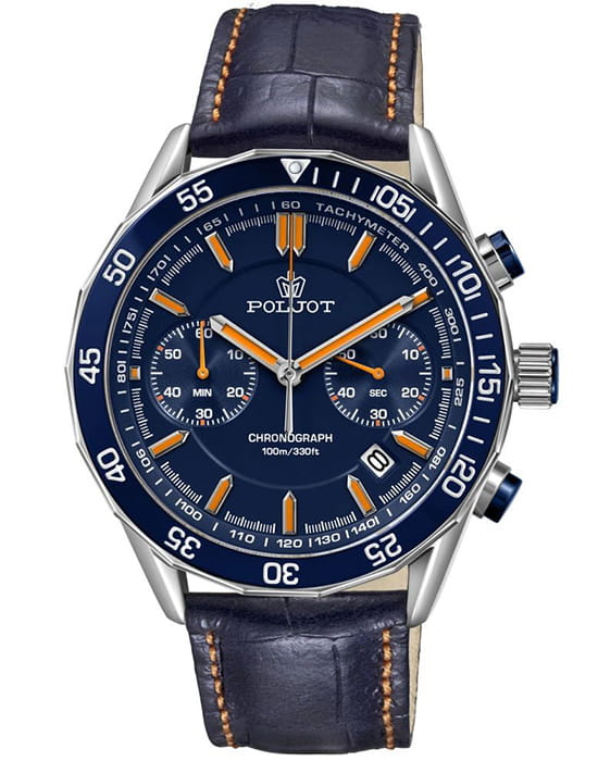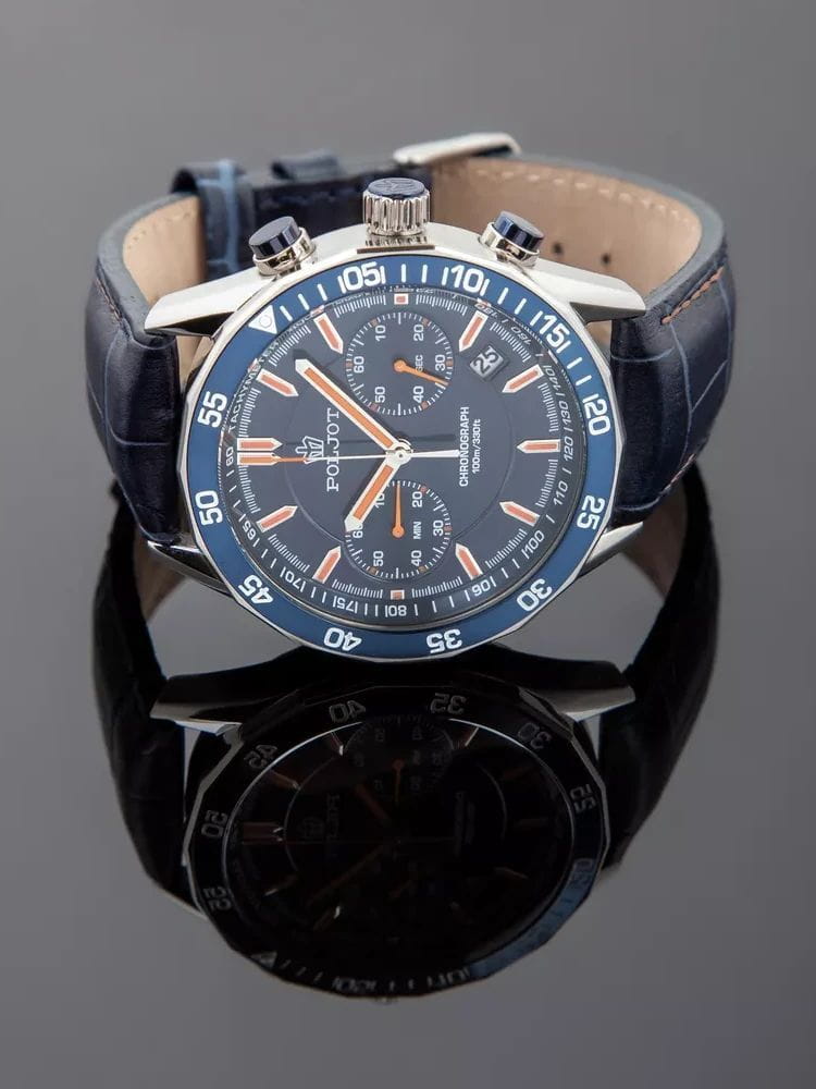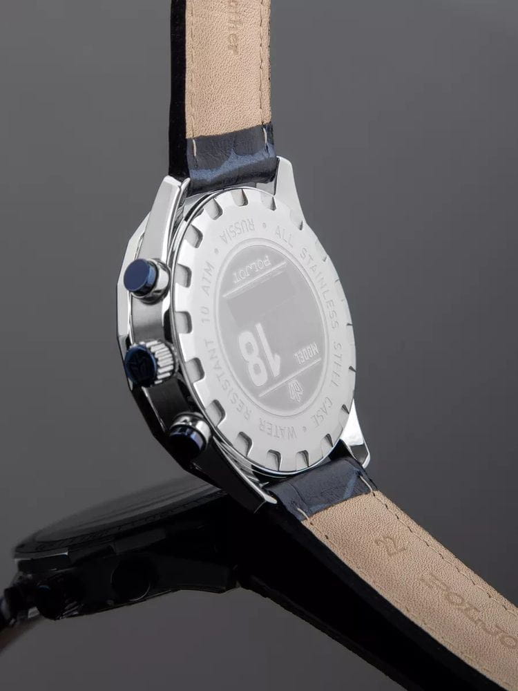 Poljot 6S21.181253 — яркие мужские часы с выразительным спортивным характером и акцентом на функциональность. Корпус из нержавеющей стали придаёт модели надёжность и солидность, а насыщенный циферблат с контрастными счётчиками хронографаХронографФункция позволяет измерять отрезки времени с особой точностью: часы, минуты, секунды. Верным признаком хронографа является наличие на циферблате 3 дополнительных окошек-счётчиков. создаёт динамичный и энергичный облик. БезельБезельВнешний ободок, закрепляющий стекло. В спортивных часах так называется поворотное кольцо с делениями на циферблате, выполняет роль таймера – замеряет отрезки времени на шкале. Неподвижный безель – элемент декора. Однонаправленно вращающийся безель на дайверских часах позволяет фиксировать моменты погружения и выныривания на поверхность. с PVD-покрытиемPVDУльтратонкое покрытие наносится в технике вакуумного напыления, сочетает в себе нитрид титана особой прочности со слоем золота или оксида хрома. Несёт в себе декоративную или защитную функцию.. Широкие стрелки и метки с люминесцентным покрытиемЛюминесцентное покрытиеПозволяет считывать показания времени в темноте. Производители наносят на стрелки, часовые индексы, безель или поверхность циферблата светонакопительный состав, дающий холодное свечение. обеспечивают отличную читаемость в любых условиях, а внешний обод с минутной шкалой подчёркивает спортивный стиль. Окно даты добавляет практичности. Прочное минеральное стеклоМинеральное стеклоМинеральное стекло представляет собой искусственно выращенный минерал кварца. Такое стекло отличается особой устойчивостью к повреждениям и царапинам. Уступает по некоторым качествам сапфировому стеклу. надёжно защищает циферблат от повреждений, а ремешок из натуральной кожи гармонично дополняет контрастную цветовую палитру. Poljot — это смелое сочетание спортивной энергии, точности и современного дизайна для активного и уверенного мужчины.