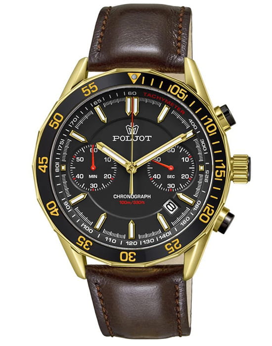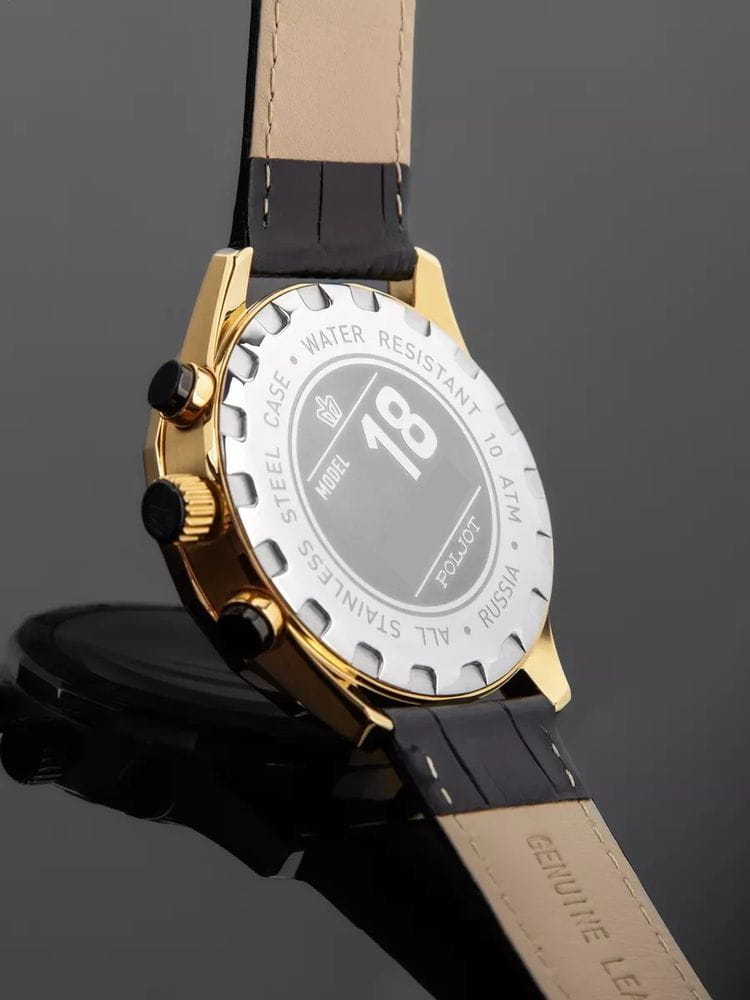 Poljot 6S21.186251 — яркие мужские часы с выразительным спортивным характером и акцентом на функциональность. Корпус из нержавеющей стали с PVD-покрытиемPVDУльтратонкое покрытие наносится в технике вакуумного напыления, сочетает в себе нитрид титана особой прочности со слоем золота или оксида хрома. Несёт в себе декоративную или защитную функцию. придаёт модели надёжность и солидность, а насыщенный циферблат с контрастными счётчиками хронографаХронографФункция позволяет измерять отрезки времени с особой точностью: часы, минуты, секунды. Верным признаком хронографа является наличие на циферблате 3 дополнительных окошек-счётчиков. создаёт динамичный и энергичный облик. БезельБезельВнешний ободок, закрепляющий стекло. В спортивных часах так называется поворотное кольцо с делениями на циферблате, выполняет роль таймера – замеряет отрезки времени на шкале. Неподвижный безель – элемент декора. Однонаправленно вращающийся безель на дайверских часах позволяет фиксировать моменты погружения и выныривания на поверхность. с PVD-покрытиемPVDУльтратонкое покрытие наносится в технике вакуумного напыления, сочетает в себе нитрид титана особой прочности со слоем золота или оксида хрома. Несёт в себе декоративную или защитную функцию.. Широкие стрелки и метки с люминесцентным покрытиемЛюминесцентное покрытиеПозволяет считывать показания времени в темноте. Производители наносят на стрелки, часовые индексы, безель или поверхность циферблата светонакопительный состав, дающий холодное свечение. обеспечивают отличную читаемость в любых условиях, а внешний обод с минутной шкалой подчёркивает спортивный стиль. Окно даты добавляет практичности. Прочное минеральное стеклоМинеральное стеклоМинеральное стекло представляет собой искусственно выращенный минерал кварца. Такое стекло отличается особой устойчивостью к повреждениям и царапинам. Уступает по некоторым качествам сапфировому стеклу. надёжно защищает циферблат от повреждений, а ремешок из натуральной кожи гармонично дополняет контрастную цветовую палитру. Poljot — это смелое сочетание спортивной энергии, точности и современного дизайна для активного и уверенного мужчины.