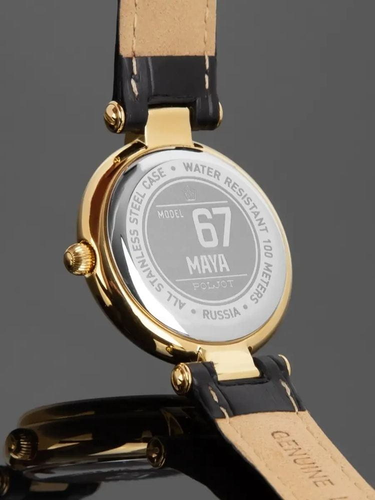 Poljot Maya NH05.676015 — утончённые женские механические часы с автоподзаводом, в которых классическая элегантность сочетается с современным характером. Корпус из нержавеющей стали с PVD-покрытиемPVDУльтратонкое покрытие наносится в технике вакуумного напыления, сочетает в себе нитрид титана особой прочности со слоем золота или оксида хрома. Несёт в себе декоративную или защитную функцию. подчёркивает изящество формы, а глубокий синий циферблат, украшенный кристаллами вместо меток, придаёт модели благородное сияние. Римская цифра XII и аккуратное окно даты на позиции «6 часов» сохраняют баланс и утончённость дизайна. Механизм NH05 SEIKO (Япония) обеспечивает плавный ход стрелок и надёжную работу. Прочное минеральное стеклоМинеральное стеклоМинеральное стекло представляет собой искусственно выращенный минерал кварца. Такое стекло отличается особой устойчивостью к повреждениям и царапинам. Уступает по некоторым качествам сапфировому стеклу. защищает циферблат от повреждений, а ремешок из натуральной кожи гарантирует комфорт и элегантное прилегание. Poljot — воплощение женственности, точности и утончённого вкуса, созданное для тех, кто ценит механику в изысканном исполнении.