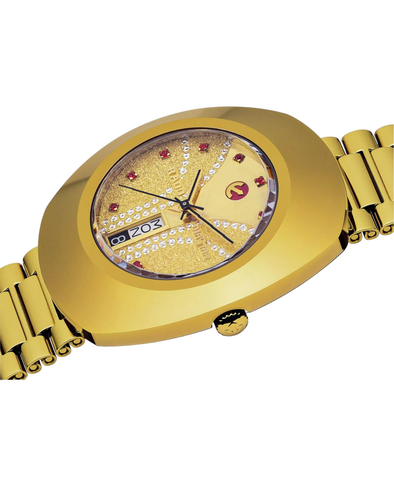 Мужские часы Rado The Original Automatic R12413034 с надёжным автоматическим механизмом. Корпус часов выполнен из нержавеющей стали c PVD-покрытиемPVDУльтратонкое покрытие наносится в технике вакуумного напыления, сочетает в себе нитрид титана особой прочности со слоем золота или оксида хрома. Несёт в себе декоративную или защитную функцию.. Стальной браслет на застёжке-бабочке с кнопкамиЗастёжка "бабочка"Такой вид застёжки дополняется предохранителями, помогающими избежать случайного раскрытия браслета. Обладают изящным исполнением. . Класс водозащиты: 30 метров, позволит защитить корпус от случайных брызг или капель дождя. Циферблат инкрустирован сапфирами. Окошко даты и дня недели находятся в положении 6 часов.