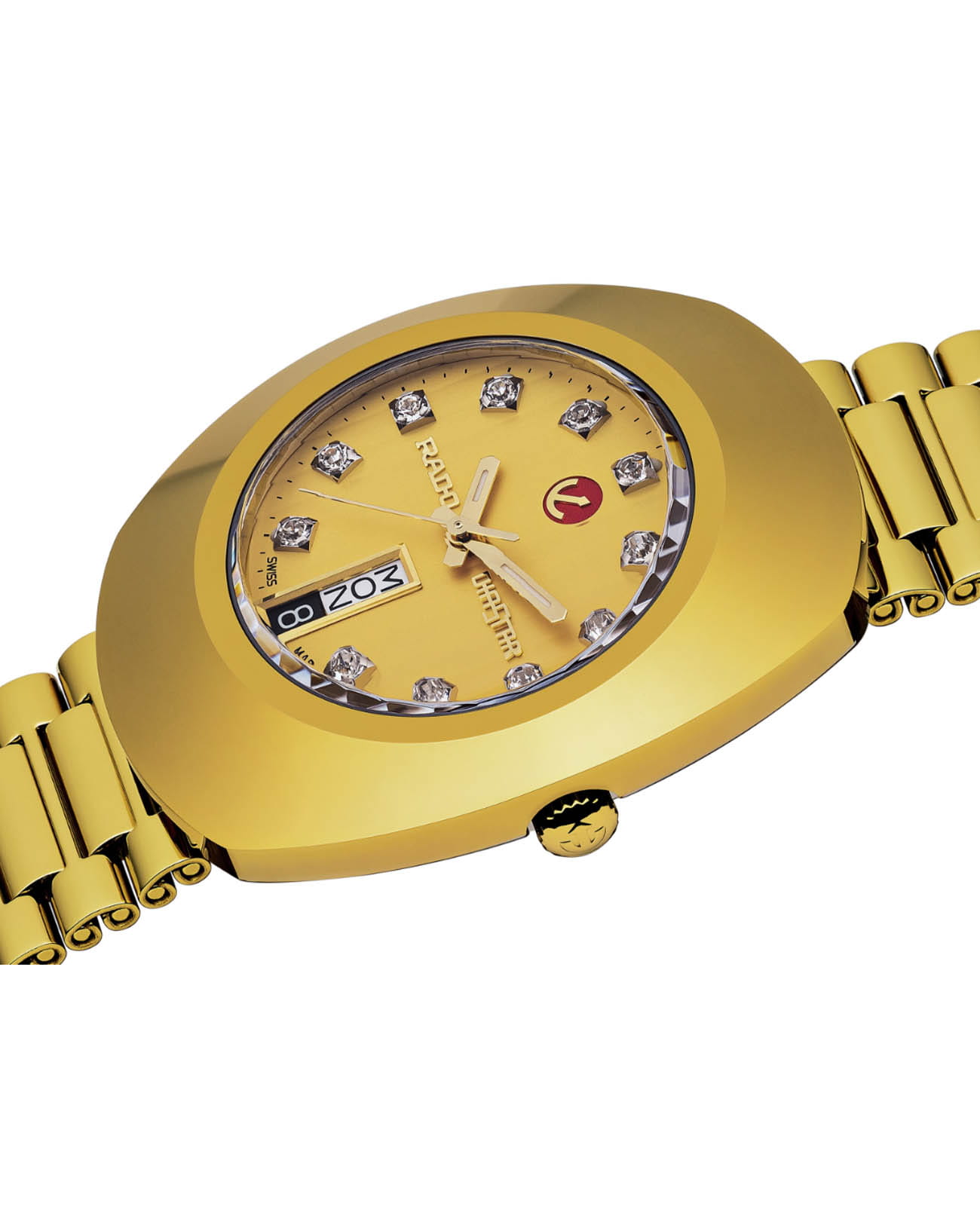 Мужские часы Rado The Original Automatic R12413493 с надёжным автоматическим механизмом. Корпус и браслет часов выполнены из нержавеющей стали c PVD-покрытиемPVDУльтратонкое покрытие наносится в технике вакуумного напыления, сочетает в себе нитрид титана особой прочности со слоем золота или оксида хрома. Несёт в себе декоративную или защитную функцию.. Стальной браслет на раскладной застёжкеРаскладная застёжкаТакой тип застёжки используется только на браслетах из металла. Она никогда не раскрывается полностью, происходит разделение на 2 и более частей. Раскладывающая застёжка снизит вероятность потери часов к минимуму.. Класс водозащиты: 30 метров, позволит защитить корпус от случайных брызг или капель дождя. Циферблат инкрустирован сапфирами. Окошко даты и дня недели находится в положении 6 часов. Стрелки и метки с люминесцентным покрытиемЛюминесцентное покрытиеПозволяет считывать показания времени в темноте. Производители наносят на стрелки, часовые индексы, безель или поверхность циферблата светонакопительный состав, дающий холодное свечение..