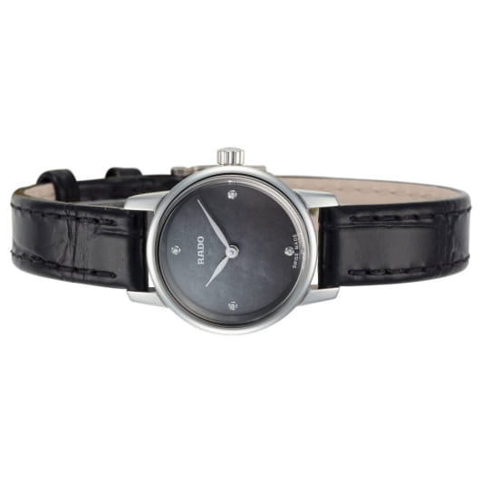 Женские швейцарские наручные часы Rado Coupole Classic R22890965 с надёжным кварцевым механизмом. Корпус часов изготовлен из нержавеющей стали. Сапфировое стеклоСапфировое стеклоПрочный и надёжный материал из кристалла сапфира синтетического происхождения, характеризующийся особой твёрдостью и устойчивостью к царапинам и повреждениям., устойчивое к мелким механическим повреждениям. Циферблат украшают бриллианты. Класс водозащиты: 50 метров, позволит защитить корпус от случайных брызг или капель дождя. Кожаный ремешок на стандартной застежке.