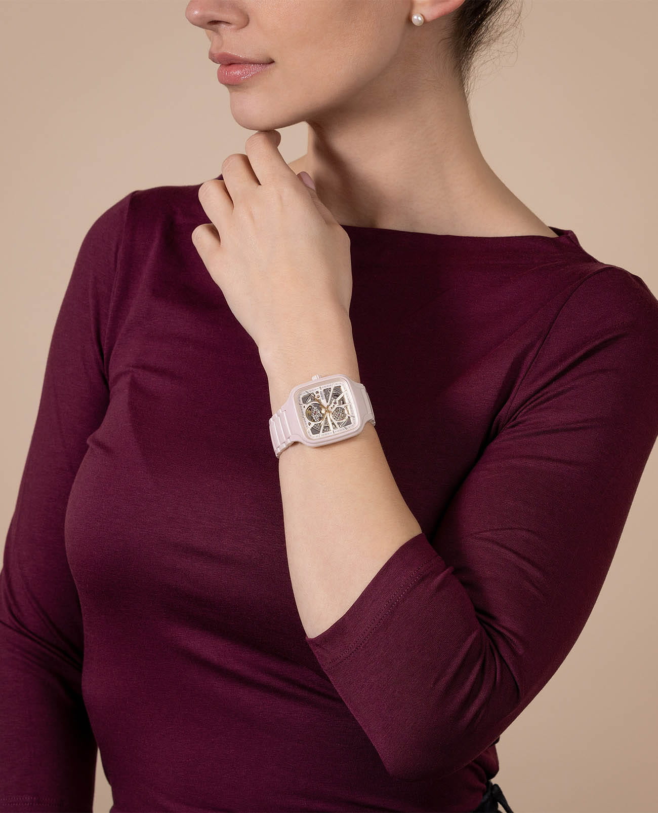 Женские механические часы с автоподзаводом Rado из коллекции True Square — это уникальное сочетание передовых технологий и высокого часового искусства. Корпус квадратной формы, размером 38 мм и толщиной 9,7 мм, выполнен из цельного блока высокотехнологичной керамикиВысокотехнологичная керамикаИнновационный запатентованный Rado материал с гладкой или матовой поверхностью. Керамика за счёт кристаллической структуры обладает повышенной устойчивостью от возникновения царапин. Материал способен принимать температуру тела человека, обеспечивая невероятный комфорт при ношении. розового цвета, что обеспечивает лёгкость, гипоаллергенность и исключительную прочность. Циферблат бежевого цвета с эффектом «солнечные лучи» оформлен накладными индексами розового золота, заполненными люминесцентным покрытиемЛюминесцентное покрытиеПозволяет считывать показания времени в темноте. Производители наносят на стрелки, часовые индексы, безель или поверхность циферблата светонакопительный состав, дающий холодное свечение. Super-Luminova®. Особенностью модели является скелетонизированная архитектура «open heart», через которую видны декорированные элементы механизма: кольцевая шлифовка на видимой части механизма и узор «Côtes de Genève» на плате. В центре циферблата — подвижный якорь розового цвета, символ бренда. Циферблат защищён плоским сапфировым стекломСапфировое стеклоПрочный и надёжный материал из кристалла сапфира синтетического происхождения, характеризующийся особой твёрдостью и устойчивостью к царапинам и повреждениям.. Механизм — автоматический с запасом хода 80 часов, 25 камнями и антимагнитной пружиной Nivachron™Nivachron™Специально разработанный инновационный сплав Nivachron™ повышает устойчивость часов к воздействию магнитных полей.. Часы оснащены браслетом из высокотехнологичной керамикиВысокотехнологичная керамикаИнновационный запатентованный Rado материал с гладкой или матовой поверхностью. Керамика за счёт кристаллической структуры обладает повышенной устойчивостью от возникновения царапин. Материал способен принимать температуру тела человека, обеспечивая невероятный комфорт при ношении. розового цвета с застёжкой «бабочка» с кнопкамиЗастёжка "бабочка"Такой вид застёжки дополняется предохранителями, помогающими избежать случайного раскрытия браслета. Обладают изящным исполнением. из титана. Водонепроницаемость 50 м позволяет использовать часы в повседневных условиях. Гарантия — 2 года. Идеальный выбор для тех, кто ценит инновации, дизайн и швейцарское качество.