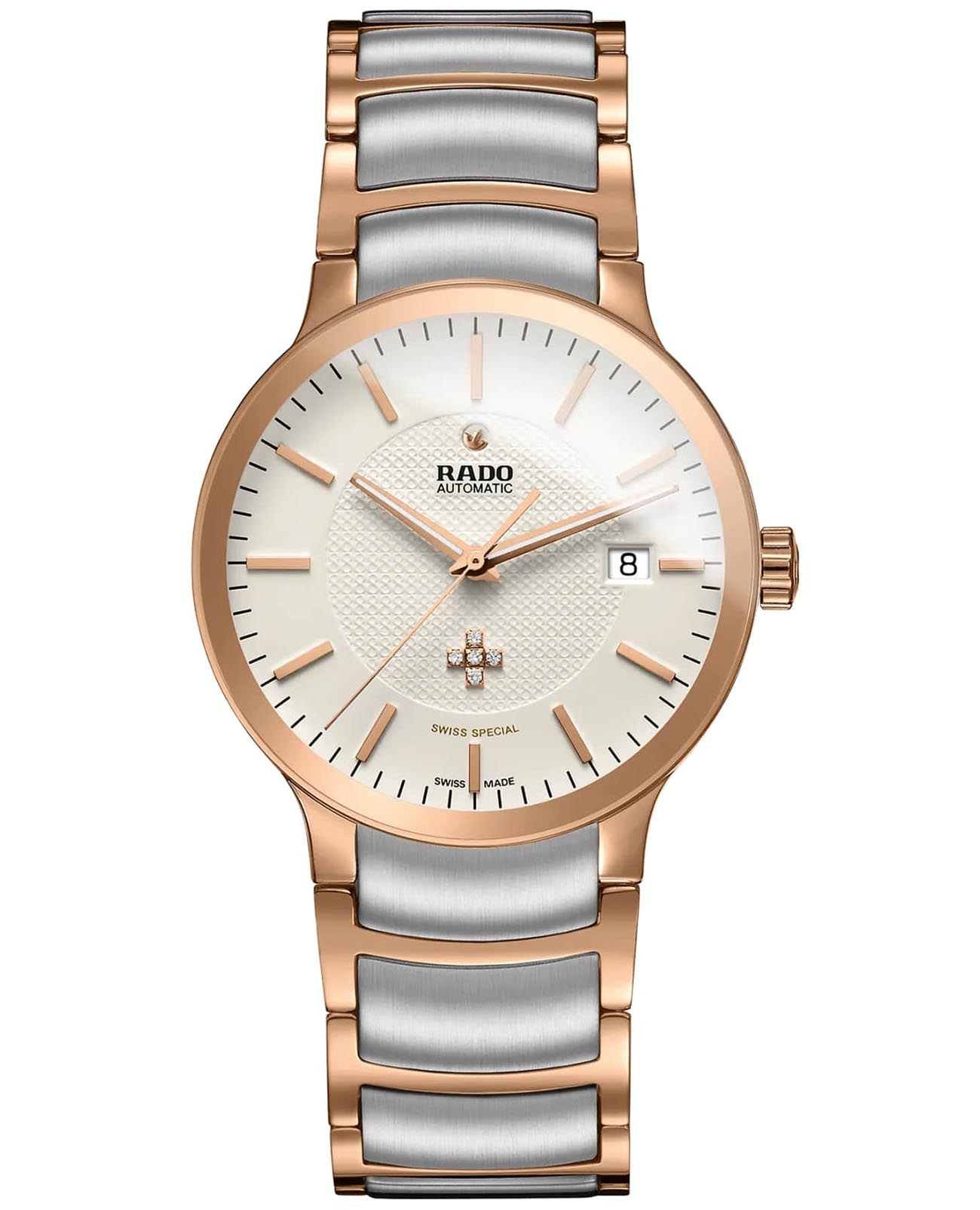 Наручные часы премиальной категории объединяют безупречность стиля и высокую точность хода, позволяя чувствовать себя на высоте в любой ситуации. Циферблат выполнен с метками виде штрихов и украшен бриллиантами. Стрелки и метки с люминесцентным покрытиемЛюминесцентное покрытиеПозволяет считывать показания времени в темноте. Производители наносят на стрелки, часовые индексы, безель или поверхность циферблата светонакопительный состав, дающий холодное свечение.. Привлекательно выглядит сочетание нержавеющей стали 316L с частичным PVD-покрытиемPVDУльтратонкое покрытие наносится в технике вакуумного напыления, сочетает в себе нитрид титана особой прочности со слоем золота или оксида хрома. Несёт в себе декоративную или защитную функцию. и высокотехнологичной керамикиВысокотехнологичная керамикаИнновационный запатентованный Rado материал с гладкой или матовой поверхностью. Керамика за счёт кристаллической структуры обладает повышенной устойчивостью от возникновения царапин. Материал способен принимать температуру тела человека, обеспечивая невероятный комфорт при ношении., такое решение нашло воплощение в браслете. Прозрачная задняя крышка. Сапфировое стеклоСапфировое стеклоПрочный и надёжный материал из кристалла сапфира синтетического происхождения, характеризующийся особой твёрдостью и устойчивостью к царапинам и повреждениям.. Отображение даты в положении "3 часа". Диаметр корпуса: 38 мм. Rado calibre 658 (ETA 2824-2) механизм с автоподзаводом и 38-часовым запасом хода.