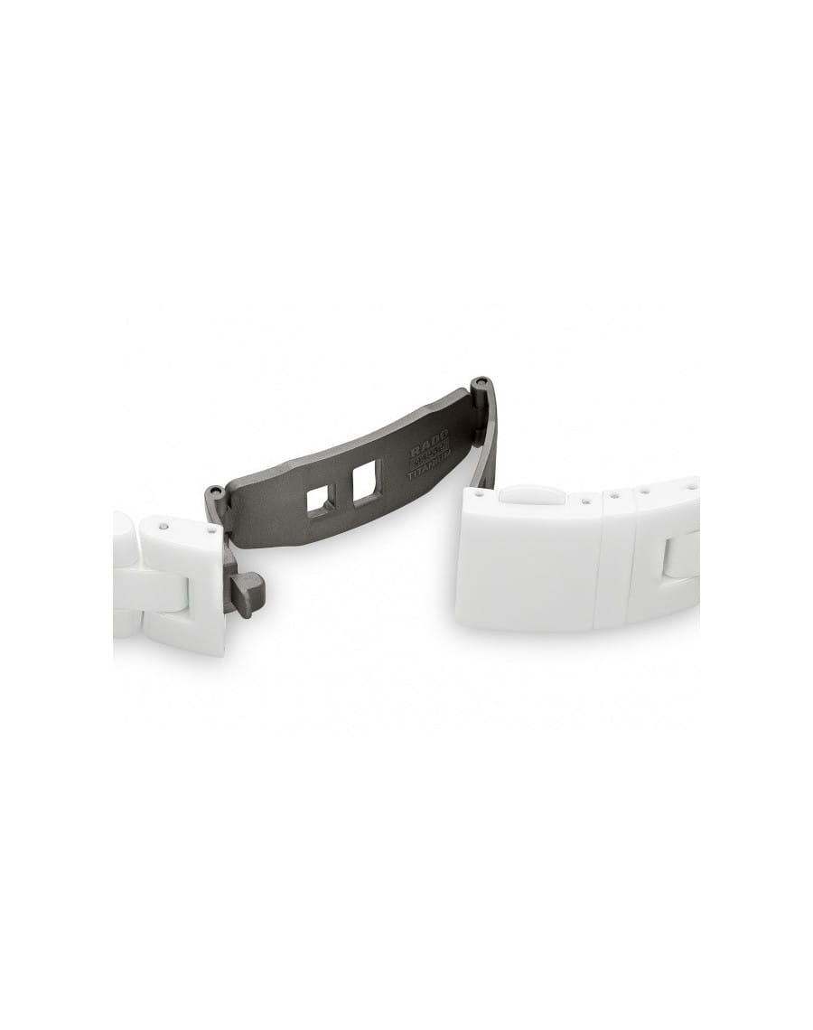 Rado HyperChrome R32311902 — роскошные часы швейцарского бренда Rado. Корпус часов изготовлен из керамики. Сапфировое стеклоСапфировое стеклоПрочный и надёжный материал из кристалла сапфира синтетического происхождения, характеризующийся особой твёрдостью и устойчивостью к царапинам и повреждениям.. БезельБезельВнешний ободок, закрепляющий стекло. В спортивных часах так называется поворотное кольцо с делениями на циферблате, выполняет роль таймера – замеряет отрезки времени на шкале. Неподвижный безель – элемент декора. Однонаправленно вращающийся безель на дайверских часах позволяет фиксировать моменты погружения и выныривания на поверхность. украшен 60 бриллиантами общим весом 0,834 карата. Водонепроницаемость 50 метров, позволит защитить корпус от случайных брызг или капель дождя. Циферблат часов выполнен из белого перламутра, индексы выполнены в виде линий. Часы оснащены указателем даты.Ремешок часов изготовлен из высокотехнологичной керамикиВысокотехнологичная керамикаИнновационный запатентованный Rado материал с гладкой или матовой поверхностью. Керамика за счёт кристаллической структуры обладает повышенной устойчивостью от возникновения царапин. Материал способен принимать температуру тела человека, обеспечивая невероятный комфорт при ношении. белого цвета и нержавеющей стали.
