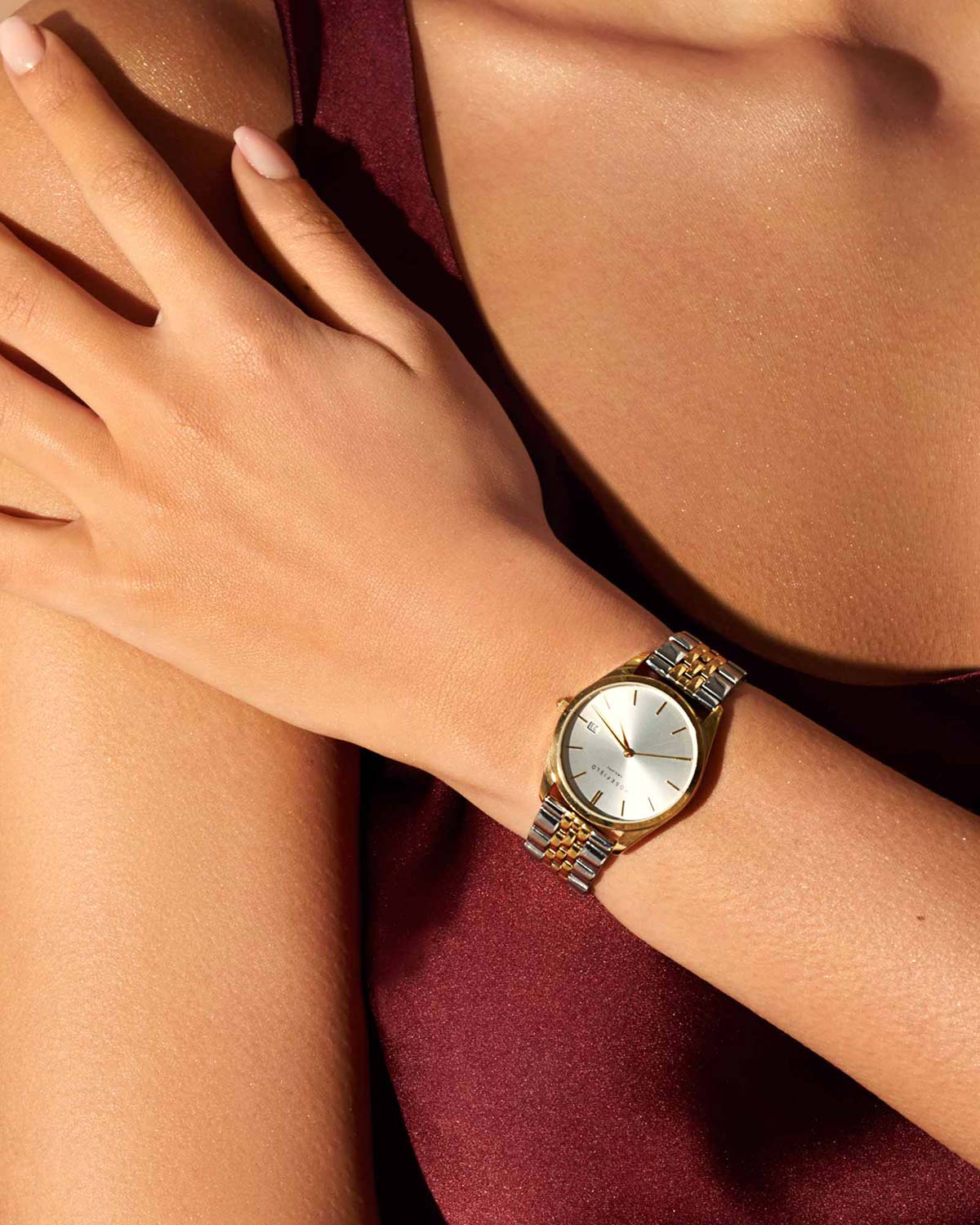 Класс водозащиты 30 метров обеспечивает защиту корпуса от случайных брызг воды или капель дождя, что делает эти часы отличным выбором для активного образа жизни. Стальной браслет с частичным PVD-покрытиемPVDУльтратонкое покрытие наносится в технике вакуумного напыления, сочетает в себе нитрид титана особой прочности со слоем золота или оксида хрома. Несёт в себе декоративную или защитную функцию. и ювелирной застежкой обеспечивает комфортное и безопасное ношение, дополняя общий дизайн часов.
