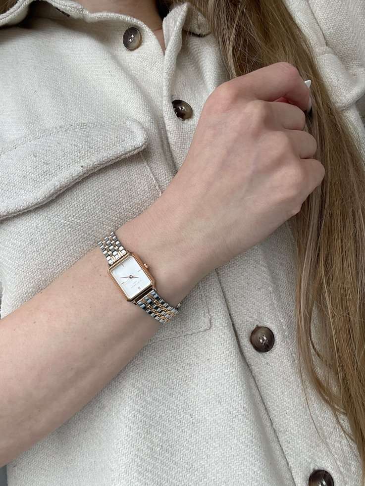 Женские кварцевые часы. Центральные часовая, минутная и секундная стрелки. Серебристый циферблат. Восьмиугольный корпус выполнен из металла с IP покрытием цвета розового золота. Размер корпуса составляет 19,5 х 24 мм, толщина 7 мм. Стальной браслет с частичным покрытием, браслетная застежка. Прочное минеральное стекло устойчивое к мелким механическим повреждениям. Водостойкость WR 30 (брызги).