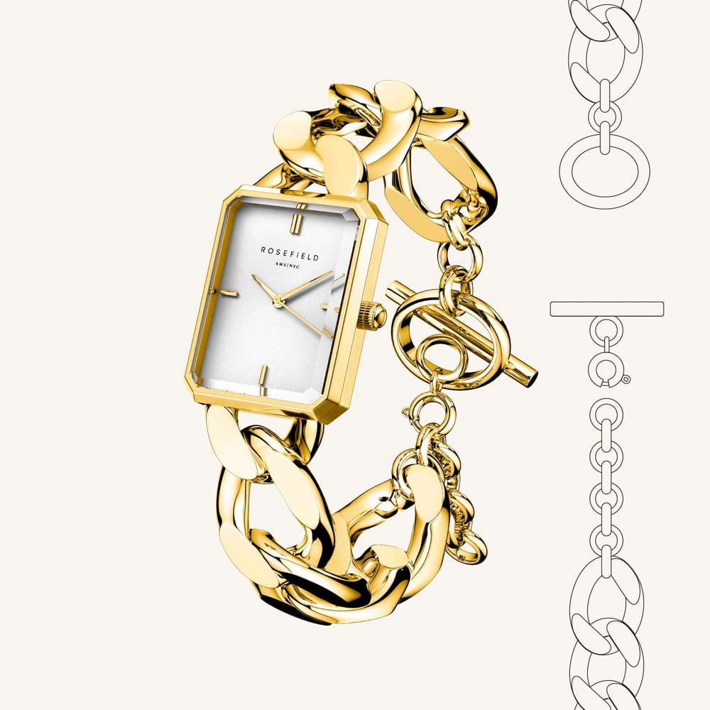 Часы Rosefield Octagon XS Studio (модель SWGSG-O55) — это элегантный женский аксессуар, сочетающий современный дизайн и высокое качество. Корпус восьмиугольной формы размером 19,5 x 24 мм выполнен из нержавеющей стали с PVD-покрытиемPVDУльтратонкое покрытие наносится в технике вакуумного напыления, сочетает в себе нитрид титана особой прочности со слоем золота или оксида хрома. Несёт в себе декоративную или защитную функцию. золотистого цвета, что придаёт часам утончённый и стильный вид. Белый циферблат с золотистыми часовыми метками и стрелками обеспечивает отличную читаемость. Циферблат защищён минеральным стекломМинеральное стеклоМинеральное стекло представляет собой искусственно выращенный минерал кварца. Такое стекло отличается особой устойчивостью к повреждениям и царапинам. Уступает по некоторым качествам сапфировому стеклу., устойчивым к царапинам.