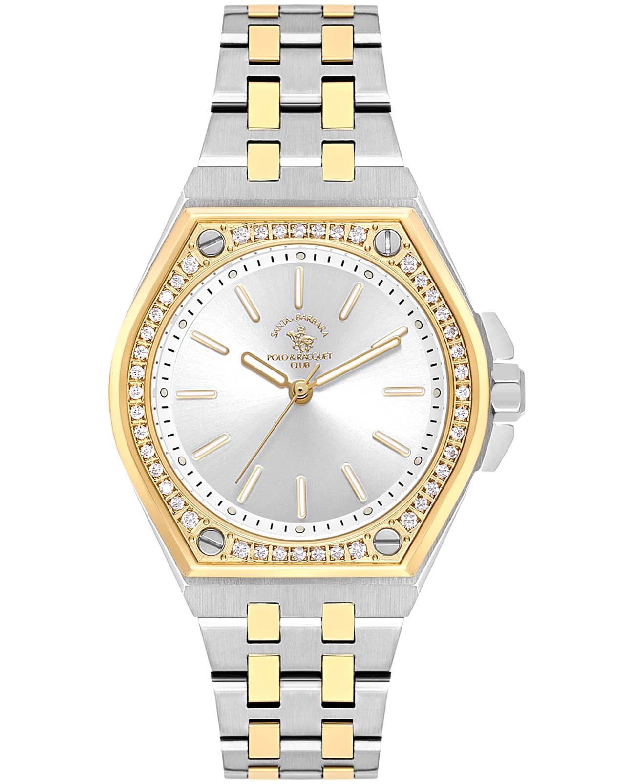 Женские кварцевые Santa Barbara Polo & Racquet Club SB.1.10589-3 — воплощение элегантности и технического совершенства. Изысканный корпус из нержавеющей стали, диаметром 36 мм, что делает их устойчивыми к внешним воздействиям и придает благородный вид. Стрелки и метки с люминесцентным покрытиемЛюминесцентное покрытиеПозволяет считывать показания времени в темноте. Производители наносят на стрелки, часовые индексы, безель или поверхность циферблата светонакопительный состав, дающий холодное свечение., обеспечивающим хорошую читаемость в темноте. Изящный циферблат защищён минеральным стекломМинеральное стеклоМинеральное стекло представляет собой искусственно выращенный минерал кварца. Такое стекло отличается особой устойчивостью к повреждениям и царапинам. Уступает по некоторым качествам сапфировому стеклу., устойчивое к царапинам и механическим повреждениям. Браслет из стали с частичным IP-покрытиемIP-покрытиеМетод ионного напыления. Демонстрирует повышенную устойчивость к истиранию, окислению и химическим веществам. Под воздействием высокого давления и температуры около 1500°C молекулы металла надёжно соединяются с частицами корпуса часов. на застёжке-бабочке с кнопкамиЗастёжка "бабочка"Такой вид застёжки дополняется предохранителями, помогающими избежать случайного раскрытия браслета. Обладают изящным исполнением. обеспечивает комфортное и безопасное ношение. Декоративный безельБезельВнешний ободок, закрепляющий стекло. В спортивных часах так называется поворотное кольцо с делениями на циферблате, выполняет роль таймера – замеряет отрезки времени на шкале. Неподвижный безель – элемент декора. Однонаправленно вращающийся безель на дайверских часах позволяет фиксировать моменты погружения и выныривания на поверхность. с IP-покрытиемIP-покрытиеМетод ионного напыления. Демонстрирует повышенную устойчивость к истиранию, окислению и химическим веществам. Под воздействием высокого давления и температуры около 1500°C молекулы металла надёжно соединяются с частицами корпуса часов. золотистого цвета украшен кристаллами. Водонепроницаемость 50 метров позволит защитить корпус от случайных брызг или капель дождя. Идеальный выбор для тех, кто ценит элегантный дизайн и качество.