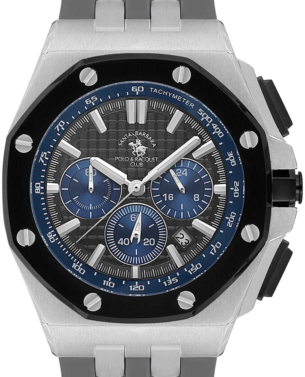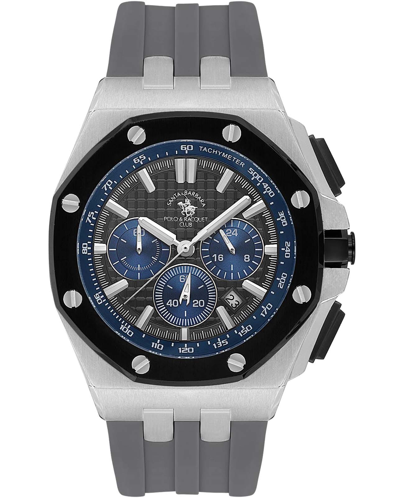 Мужские кварцевые часы-хронографХронографФункция позволяет измерять отрезки времени с особой точностью: часы, минуты, секунды. Верным признаком хронографа является наличие на циферблате 3 дополнительных окошек-счётчиков. с секундомеромСекундомерСекундоме́р — прибор, способный измерять интервалы времени с точностью до долей секунды. Santa Barbara Polo & Racquet Club SB.1.10601-4 — воплощение элегантности и технического совершенства. Корпус из нержавеющей стали, диаметром 44,5 мм, что делает их устойчивыми к внешним воздействиям и придает благородный вид. Стрелки и метки с люминесцентным покрытиемЛюминесцентное покрытиеПозволяет считывать показания времени в темноте. Производители наносят на стрелки, часовые индексы, безель или поверхность циферблата светонакопительный состав, дающий холодное свечение., обеспечивающим хорошую читаемость в темноте. Неподвижный безельБезельВнешний ободок, закрепляющий стекло. В спортивных часах так называется поворотное кольцо с делениями на циферблате, выполняет роль таймера – замеряет отрезки времени на шкале. Неподвижный безель – элемент декора. Однонаправленно вращающийся безель на дайверских часах позволяет фиксировать моменты погружения и выныривания на поверхность. с IP-покрытиемIP-покрытиеМетод ионного напыления. Демонстрирует повышенную устойчивость к истиранию, окислению и химическим веществам. Под воздействием высокого давления и температуры около 1500°C молекулы металла надёжно соединяются с частицами корпуса часов. черного цвета. Циферблат защищён минеральным стекломМинеральное стеклоМинеральное стекло представляет собой искусственно выращенный минерал кварца. Такое стекло отличается особой устойчивостью к повреждениям и царапинам. Уступает по некоторым качествам сапфировому стеклу. устойчивое к царапинам и механическим повреждениям. Окошко даты находится в положении между отметками 4 и 5 часов, тахиметрТахиметрРазмеченная шкала, располагается на ободке или безеле часов. Тахиметр позволяет рассчитать скорость на определённом участке пути, расстояние измеряется в километрах или милях. по внешнему краю. Силиконовый ремешок на стандартной застёжке обеспечивает комфортное и безопасное ношение. Водонепроницаемость 50 метров позволит защитить корпус от случайных брызг или капель дождя. Идеальный выбор для тех, кто ценит элегантный дизайн и качество.