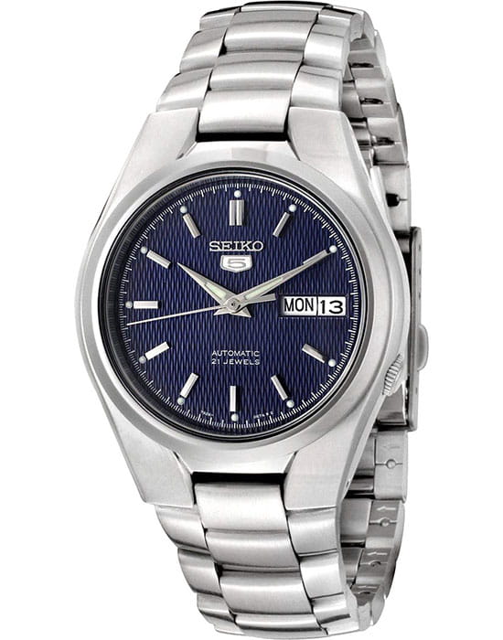 Наручные часы имеют синий циферблат, дополненный узором в спортивном стиле. Компактная модель привлекает универсальным исполнением, будет хорошо смотреться с повседневной, деловой, спортивной одеждой. Аксессуар сделан из стали 316L, серебристый металл устойчив к деформации, повреждениям, коррозии. Внутри надёжного корпуса находится японский автоматический механизм Seiko 7S26, характеризующийся запасом хода до 40 часов. Наблюдать за его работой можно через прозрачную заднюю крышку. Для защиты циферблата используется минеральное стекло Hardlex повышенной прочности. Стрелки имеют люминесцентную подсветкуЛюминесцентное покрытиеПозволяет считывать показания времени в темноте. Производители наносят на стрелки, часовые индексы, безель или поверхность циферблата светонакопительный состав, дающий холодное свечение.. Часы оснащены функцией календаря с индикацией числа и дня недели. Диаметр корпуса: 36 мм.