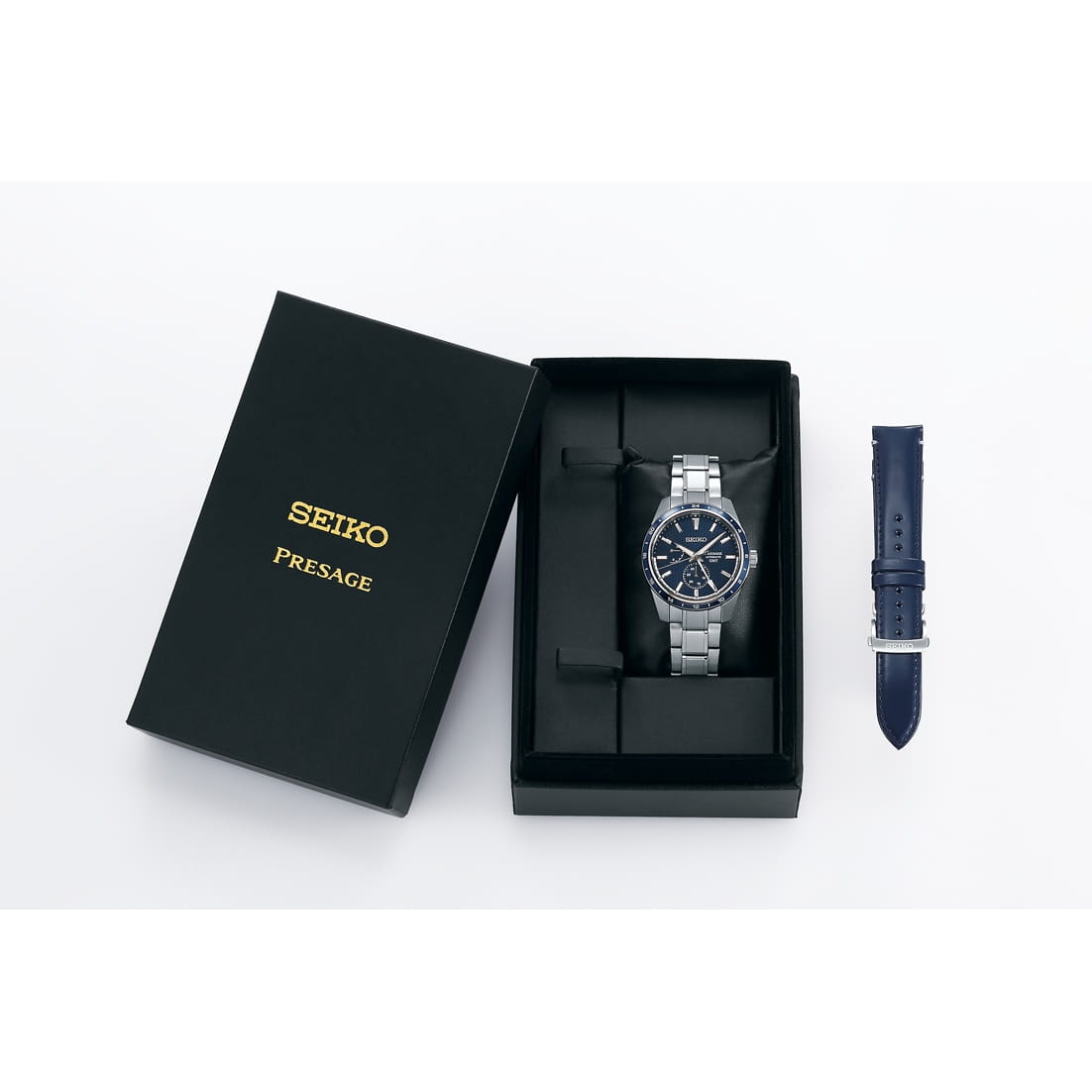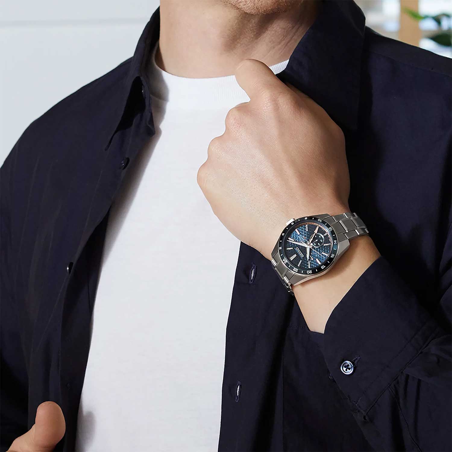 Механические часы Seiko Presage Sharp Edged GMT SPB303 — это лимитированная серия, выпущенная тиражом всего 900 экземпляров. Дизайн циферблата вдохновлён древним японским узором «Асаноха», известным ещё с эпохи Хэйан и отражающим философию гармонии и природной целостности. Часы оснащены калибром 6R64 — надёжным механическим механизмом с автоподзаводом и возможностью ручной подзаводки. Механизм работает на частоте 28 800 полуколебаний в час, имеет 29 драгоценных камней и обеспечивает запас хода до 45 часов с на циферблате. Также реализованы функция стоп-секунды для точной установки времени, отображение второго часового пояса в 24-часовом формате центральной стрелкой, а также календарная корректировка разницы во времениВторой часовой поясФункция, позволяющая отображать время двух часовых поясов одновременно., что делает модель особенно удобной для путешественников. Циферблат оформлен штриховыми метками, а дата вынесена на отдельный малый циферблат в положении 6 часов. Стрелки и индексы дополнены люминесцентным покрытиемЛюминесцентное покрытиеПозволяет считывать показания времени в темноте. Производители наносят на стрелки, часовые индексы, безель или поверхность циферблата светонакопительный состав, дающий холодное свечение. LumiBrite, обеспечивающим отличную читаемость даже в условиях слабого освещения. Защиту циферблата обеспечивает сапфировое стеклоСапфировое стеклоПрочный и надёжный материал из кристалла сапфира синтетического происхождения, характеризующийся особой твёрдостью и устойчивостью к царапинам и повреждениям. с антибликовым покрытием на внутренней поверхности, что делает его не только прочным, но и удобным для считывания информации при любом освещении. Корпус изготовлен из стали с частичным PVD-покрытиемPVDУльтратонкое покрытие наносится в технике вакуумного напыления, сочетает в себе нитрид титана особой прочности со слоем золота или оксида хрома. Несёт в себе декоративную или защитную функцию., придающим модели благородный внешний вид. Заводная головка имеет рифлёную форму, а задняя крышка — завинчивающуюся конструкцию с прозрачным окном и гравировкой уникального серийного номера, что подчёркивает эксклюзивность каждой модели. Браслет выполнен из нержавеющей стали и оснащён трёхсгибной раскладной застёжкойРаскладная застёжкаТакой тип застёжки используется только на браслетах из металла. Она никогда не раскрывается полностью, происходит разделение на 2 и более частей. Раскладывающая застёжка снизит вероятность потери часов к минимуму. с кнопочным механизмом, обеспечивающей комфорт и надёжность при ношении. В комплекте также предусмотрен сменный кожаный ремешок для более неформального образа. Часы обладают водонепроницаемостью WR 100, что позволяет использовать их при плавании или занятиях водными видами спорта без глубокого погружения. Эти часы станут идеальным выбором для тех, кто ценит историю, точность и эстетику — универсальный аксессуар, сочетающий в себе японское мастерство, практичность и современный дизайн.