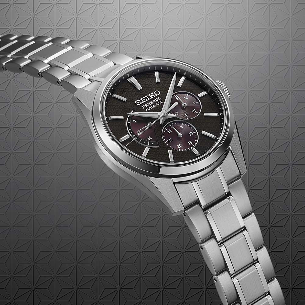 Механические часы Seiko Presage Sharp Edged SPB307 — это сочетание японского искусства и современных технологий. Их дизайн вдохновлён древним узором «Асаноха», известным ещё с эпохи Хэйан и отражающим философию гармонии и природной целостности. Часы оснащены калибром 6R21 — надёжным механизмом с автоподзаводом и возможностью ручной подзаводки. Механизм работает на частоте 28 800 полуколебаний в час, имеет 29 драгоценных камней и обеспечивает запас хода до 45 часов с на циферблате. Также реализована функция стоп-секунды для точной установки времени. Циферблат оформлен штриховыми метками, а информация о числе и дне недели вынесена на отдельные малые циферблаты, что делает функционал часов удобным и визуально сбалансированным. Стрелки и метки дополнены люминесцентным покрытиемЛюминесцентное покрытиеПозволяет считывать показания времени в темноте. Производители наносят на стрелки, часовые индексы, безель или поверхность циферблата светонакопительный состав, дающий холодное свечение. LumiBrite, обеспечивающим отличную читаемость даже в условиях слабого освещения. Защиту циферблата обеспечивает сапфировое стеклоСапфировое стеклоПрочный и надёжный материал из кристалла сапфира синтетического происхождения, характеризующийся особой твёрдостью и устойчивостью к царапинам и повреждениям. с антибликовым покрытием на внутренней поверхности, что делает его не только прочным, но и удобным для считывания информации при любом освещении. Корпус изготовлен из нержавеющей стали, а задняя крышка — завинчивающаяся и прозрачная, что позволяет рассмотреть детали работы механизма. Браслет выполнен из стали и оснащён трёхсгибной раскладной застёжкойРаскладная застёжкаТакой тип застёжки используется только на браслетах из металла. Она никогда не раскрывается полностью, происходит разделение на 2 и более частей. Раскладывающая застёжка снизит вероятность потери часов к минимуму. с кнопочным механизмом, обеспечивающей надёжную фиксацию и комфорт при ношении. Часы обладают водонепроницаемостью WR 100, что позволяет использовать их при плавании или занятиях водными видами спорта без глубокого погружения. Эти часы станут идеальным аксессуаром для тех, кто ценит традиции, эстетику и современные технологии — универсальный спутник, подчёркивающий статус и индивидуальность своего владельца.