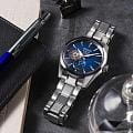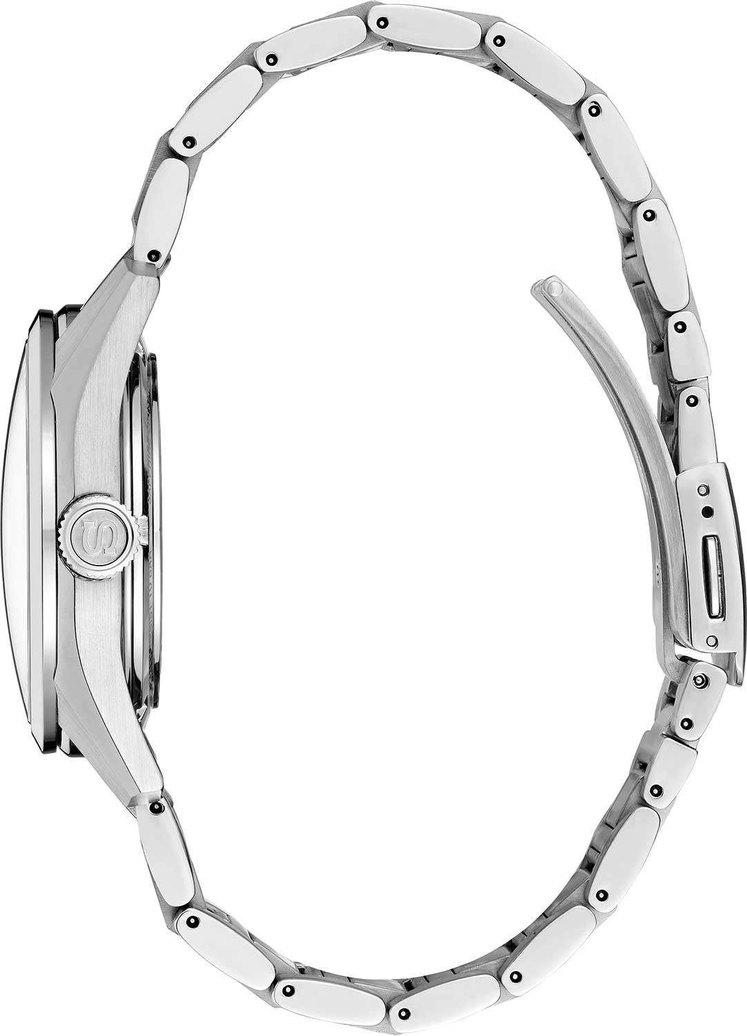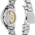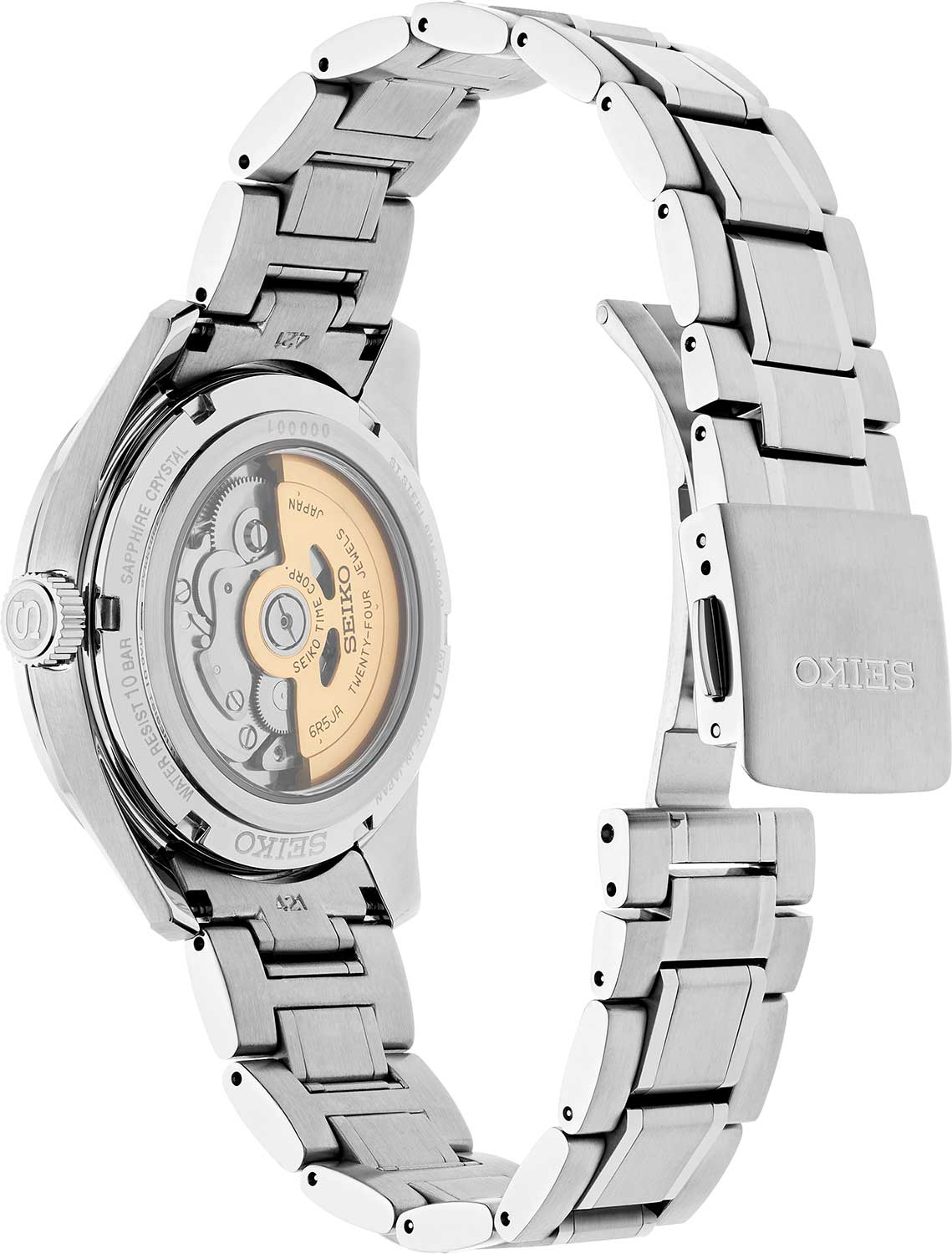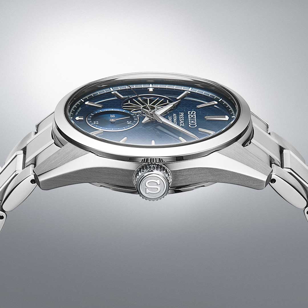 Элегантные механические часы Presage Sharp Edged продолжают серию, вдохновлённую богатым культурным наследием Японии. Их дизайн циферблата берёт мотивы из древнего узора «Асаноха», известного ещё с эпохи Хэйан и часто встречающегося в традиционных ремёслах. Эта коллекция сочетает в себе японское мастерство и современные технологии. Часы оснащены механическим калибром 6R5J с автоподзаводом и возможностью ручной подзаводки. Механизм работает на частоте 21 600 полуколебаний в час, имеет 24 драгоценных камня и обеспечивает внушительный запас хода — до 72 часов. Также реализована функция стоп-секунды для точной установки времени, а также защита от магнитных полей до 4800 А/м. Циферблат оформлен с использованием строгих штриховых меток, а через прозрачное окошко можно наблюдать за работой механизма. Часы поддерживают отображение времени в 12- и 24-часовом формате. Защиту циферблата обеспечивает сапфировое стеклоСапфировое стеклоПрочный и надёжный материал из кристалла сапфира синтетического происхождения, характеризующийся особой твёрдостью и устойчивостью к царапинам и повреждениям. выпуклой формы с антибликовым покрытием с обеих сторон, что делает его не только прочным, но и удобным для считывания информации при любом освещении. Задняя крышка выполнена завинчивающейся и прозрачной, что подчёркивает связь между внешним дизайном и внутренней технологией. Браслет изготовлен из нержавеющей стали и оснащён раскладной застёжкойРаскладная застёжкаТакой тип застёжки используется только на браслетах из металла. Она никогда не раскрывается полностью, происходит разделение на 2 и более частей. Раскладывающая застёжка снизит вероятность потери часов к минимуму., обеспечивающей надёжную фиксацию и комфорт при ношении. Часы обладают водонепроницаемостью до 100 метров, что позволяет использовать их не только в повседневной жизни, но и при плавании или занятиях водными видами спорта. Стрелки и метки дополнены люминесцентным покрытиемЛюминесцентное покрытиеПозволяет считывать показания времени в темноте. Производители наносят на стрелки, часовые индексы, безель или поверхность циферблата светонакопительный состав, дающий холодное свечение. LumiBrite, обеспечивающим отличную читаемость в условиях слабого освещения. Эти часы станут достойным аксессуаром для тех, кто ценит глубину дизайна, точность механизма и историю, воплощённую в каждом элементе.