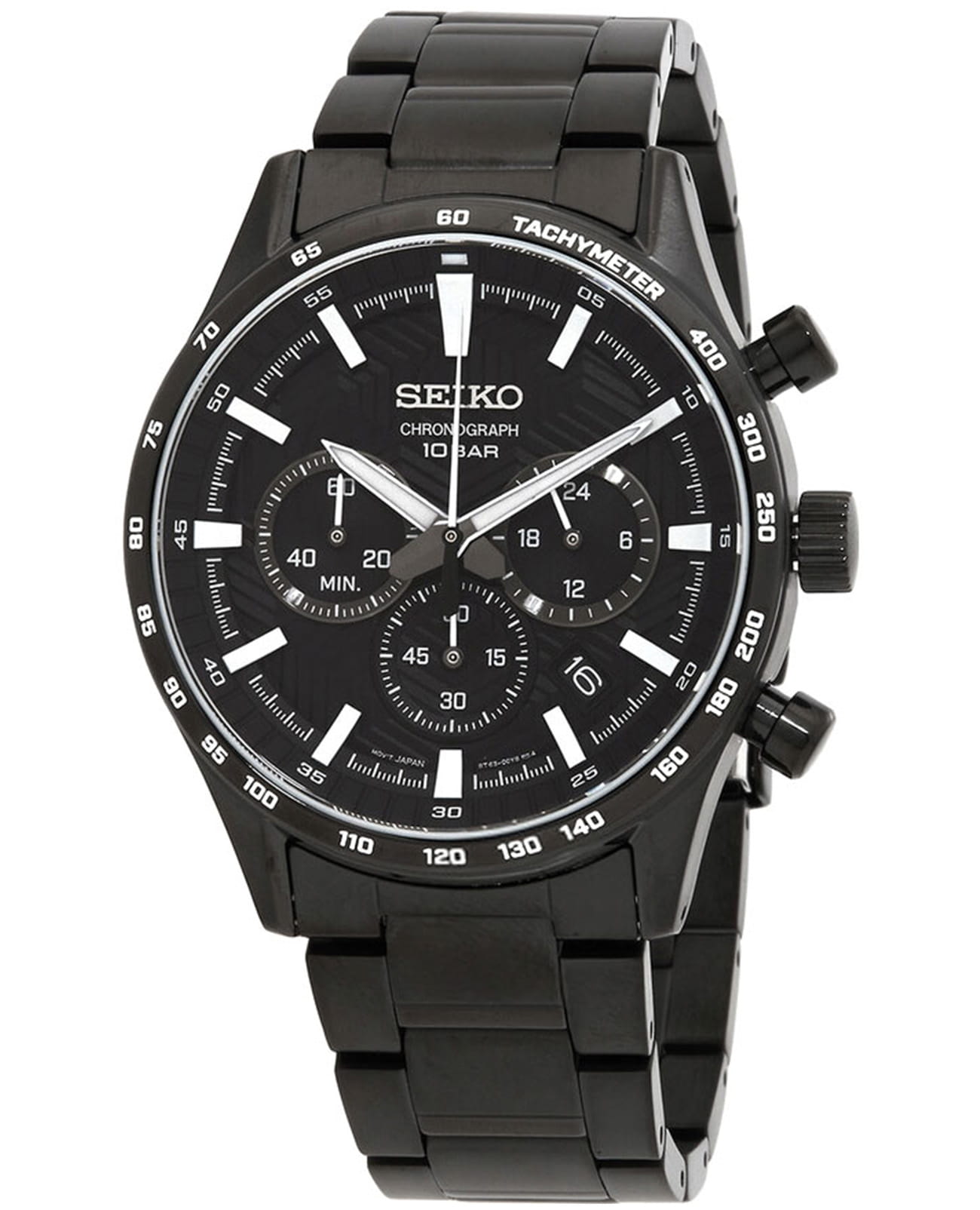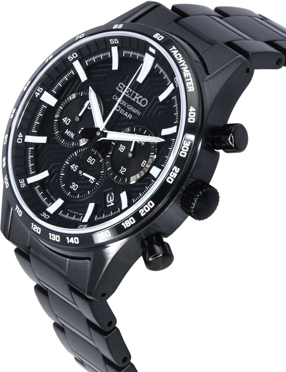 Мужские японские часы Seiko Conceptual Series Sports SSB415P1 c хронографомХронографФункция позволяет измерять отрезки времени с особой точностью: часы, минуты, секунды. Верным признаком хронографа является наличие на циферблате 3 дополнительных окошек-счётчиков., кварцевый механизм с высокой точностью. Сапфировое стеклоСапфировое стеклоПрочный и надёжный материал из кристалла сапфира синтетического происхождения, характеризующийся особой твёрдостью и устойчивостью к царапинам и повреждениям., устойчивое к появлению царапин, обладающее высокой прозрачностью. Класс водозащиты: 100 метров, позволит плавать, нырять и заниматься другими водными видами спорта. Корпус и браслет часов изготовлен из сталис PVD-покрытиемPVDУльтратонкое покрытие наносится в технике вакуумного напыления, сочетает в себе нитрид титана особой прочности со слоем золота или оксида хрома. Несёт в себе декоративную или защитную функцию.. Неподвижный безельБезельВнешний ободок, закрепляющий стекло. В спортивных часах так называется поворотное кольцо с делениями на циферблате, выполняет роль таймера – замеряет отрезки времени на шкале. Неподвижный безель – элемент декора. Однонаправленно вращающийся безель на дайверских часах позволяет фиксировать моменты погружения и выныривания на поверхность. со шкалой тахиметраТахиметрРазмеченная шкала, располагается на ободке или безеле часов. Тахиметр позволяет рассчитать скорость на определённом участке пути, расстояние измеряется в километрах или милях.. Стрелки и метки с люминесцентным покрытиемЛюминесцентное покрытиеПозволяет считывать показания времени в темноте. Производители наносят на стрелки, часовые индексы, безель или поверхность циферблата светонакопительный состав, дающий холодное свечение.. Браслет на раскладной застёжкеРаскладная застёжкаТакой тип застёжки используется только на браслетах из металла. Она никогда не раскрывается полностью, происходит разделение на 2 и более частей. Раскладывающая застёжка снизит вероятность потери часов к минимуму. с кнопками. СекундомерСекундомерСекундоме́р — прибор, способный измерять интервалы времени с точностью до долей секунды.. Окошко даты находится в положении между 4 и 5 часов.