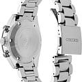 Seiko Prospex Speedtimer SSC815 — это элегантный солнечный хронограф, вдохновлённый первым хронографом Seiko, представленным на Олимпийских играх 1964 года в Токио. Модель сочетает в себе точность кварцевого механизма и экологичное питание от света благодаря технологии Tough SolarTough SolarТехнология основана на подзарядке аккумулятора от источника солнечного света, специальная панель улавливает солнечные лучи и преобразует их в энергию для работы часов. Достаточно пары минут нахождения на солнце для функционирования часов в течении суток., обеспечивая запас хода до 6 месяцев при полной зарядке. Также реализована функция предотвращения перезарядкиEOLПредставляет собой систему, уведомляющую владельца часов о необходимости замены элемента питания. За 2 недели до полного разряда батарейки секундная стрелка перестаёт ходить чётко и начинает перепрыгивать на 3-4 деления.. Часы оснащены калибром V192 с функцией отображения второго часового пояса в 12- и 24-часовом формате, а также хронографом с измерением времени до 60 минут с точностью до 1/5 секунды. Секундная стрелка вынесена на отдельный циферблат, что делает модель визуально сбалансированной и функциональной. На циферблате также присутствует тахиметрТахиметрРазмеченная шкала, располагается на ободке или безеле часов. Тахиметр позволяет рассчитать скорость на определённом участке пути, расстояние измеряется в километрах или милях. и ретроградный индикатор уровня заряда аккумулятора. Циферблат синего цвета дополнен штриховыми метками и стрелками с фирменным люминесцентным покрытиемЛюминесцентное покрытиеПозволяет считывать показания времени в темноте. Производители наносят на стрелки, часовые индексы, безель или поверхность циферблата светонакопительный состав, дающий холодное свечение. LumiBrite, обеспечивающим отличную читаемость даже в темноте. Защиту циферблата обеспечивает сапфировое стеклоСапфировое стеклоПрочный и надёжный материал из кристалла сапфира синтетического происхождения, характеризующийся особой твёрдостью и устойчивостью к царапинам и повреждениям. с выпуклой формой и антибликовым покрытием на внутренней поверхности. Корпус диаметром 39 мм изготовлен из стали с частичным PVD-покрытиемPVDУльтратонкое покрытие наносится в технике вакуумного напыления, сочетает в себе нитрид титана особой прочности со слоем золота или оксида хрома. Несёт в себе декоративную или защитную функцию., а задняя крышка — завинчивающаяся, с выгравированным серийным номером. Часы водонепроницаемы до 100 метров (), что позволяет использовать их при плавании и других водных активностях. Браслет выполнен из стали и оснащён трёхсгибной раскладной застёжкойРаскладная застёжкаТакой тип застёжки используется только на браслетах из металла. Она никогда не раскрывается полностью, происходит разделение на 2 и более частей. Раскладывающая застёжка снизит вероятность потери часов к минимуму. с кнопочным механизмом, обеспечивающей комфорт и уверенную фиксацию на запястье. Ширина браслета составляет 22 мм, что делает его совместимым со стандартными размерами. Эти часы станут универсальным аксессуаром для тех, кто ценит сочетание технологичности, истории и эстетики — идеальный выбор как для повседневной носки, так и для особых случаев.