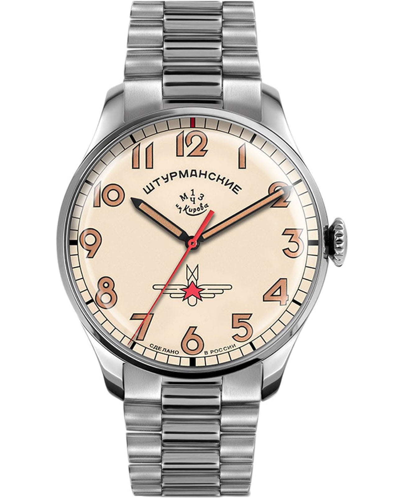 Штурманские мужские российские механические часы 2416/3905146B с механизмом высокой точности. Класс водозащиты: 50 метров, позволит защитить корпус от случайных брызг или капель дождя. Корпус часов изготовлен из стали. Минеральное стеклоМинеральное стеклоМинеральное стекло представляет собой искусственно выращенный минерал кварца. Такое стекло отличается особой устойчивостью к повреждениям и царапинам. Уступает по некоторым качествам сапфировому стеклу. устойчивое к мелким механическим повреждениям. Стальной браслет с раскладной застёжкойРаскладная застёжкаТакой тип застёжки используется только на браслетах из металла. Она никогда не раскрывается полностью, происходит разделение на 2 и более частей. Раскладывающая застёжка снизит вероятность потери часов к минимуму.. Стрелки и метки с люминесцентным покрытиемЛюминесцентное покрытиеПозволяет считывать показания времени в темноте. Производители наносят на стрелки, часовые индексы, безель или поверхность циферблата светонакопительный состав, дающий холодное свечение.. Задняя крышка украшена портретом Юрия Гагарина и крепится на 4-х винтах.
