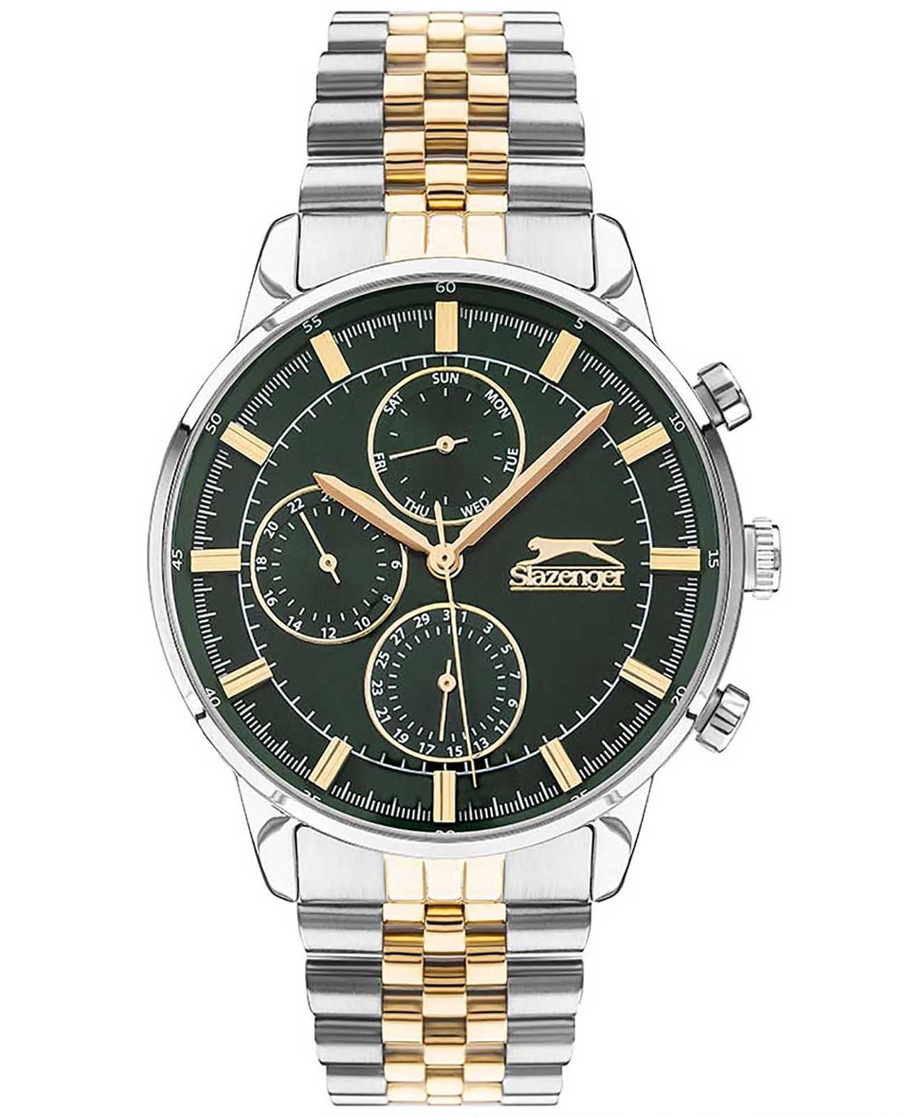 Slazenger SL.09.2036.2.04 — стильные мужские часы, сочетающие элегантный дизайн и функциональность. Корпус выполнен из суперметалла, придающей модели прочность и долговечность. Минеральное стеклоМинеральное стеклоМинеральное стекло представляет собой искусственно выращенный минерал кварца. Такое стекло отличается особой устойчивостью к повреждениям и царапинам. Уступает по некоторым качествам сапфировому стеклу. защищает циферблат от царапин и гарантирует превосходную читаемость. Циферблат с дополнительными индикаторами подчёркивает современный стиль. Браслет из суперметалла с PVD-покрытиемPVDУльтратонкое покрытие наносится в технике вакуумного напыления, сочетает в себе нитрид титана особой прочности со слоем золота или оксида хрома. Несёт в себе декоративную или защитную функцию. обеспечивает комфортное ношение и надёжную фиксацию на запястье. Функциональность дополняется индикацией даты, дня недели и 24-часовым форматом времени, повышая удобство использования. Водонепроницаемость 50 метров делает модель устойчивой к случайным брызгам и влаге, идеально подходя для повседневного ношения.