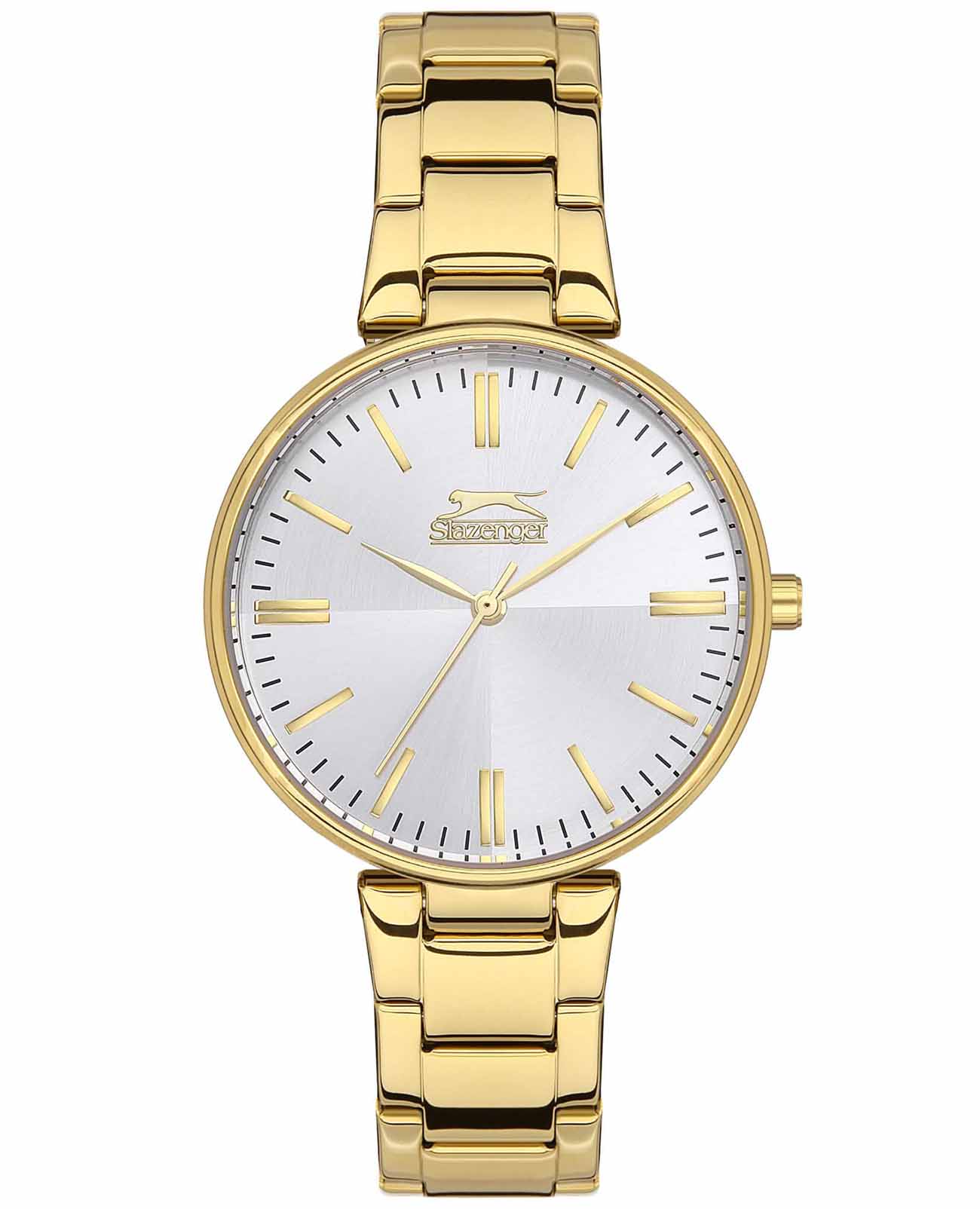 Slazenger SL.09.2122.3.05 — это элегантные женские наручные часы. Они имеют круглый циферблат с диаметром 34 мм, выполненный в золотистом цвете. Корпус часов, толщиной 9 мм, изготовлен из суперметалла с IP-покрытиемIP-покрытиеМетод ионного напыления. Демонстрирует повышенную устойчивость к истиранию, окислению и химическим веществам. Под воздействием высокого давления и температуры около 1500°C молекулы металла надёжно соединяются с частицами корпуса часов., что обеспечивает долговечность и устойчивость к коррозии. Браслет также выполнен из суперметалла IP-покрытиемIP-покрытиеМетод ионного напыления. Демонстрирует повышенную устойчивость к истиранию, окислению и химическим веществам. Под воздействием высокого давления и температуры около 1500°C молекулы металла надёжно соединяются с частицами корпуса часов., придавая часам стильный и современный вид. Размер браслета (H1-H2): 16-14 мм. Часы оснащены кварцевым механизмом, который гарантирует точность хода. Циферблат защищен минеральным стекломМинеральное стеклоМинеральное стекло представляет собой искусственно выращенный минерал кварца. Такое стекло отличается особой устойчивостью к повреждениям и царапинам. Уступает по некоторым качествам сапфировому стеклу., устойчивым к царапинам. Модель водонепроницаема до 30 метров, что позволяет носить ее во время дождя или мытья рук. Браслет оснащен раскладной застёжкойРаскладная застёжкаТакой тип застёжки используется только на браслетах из металла. Она никогда не раскрывается полностью, происходит разделение на 2 и более частей. Раскладывающая застёжка снизит вероятность потери часов к минимуму. для удобства использования. Эти часы сочетают в себе функциональность и стильный дизайн, делая их отличным аксессуаром для повседневного использования и особых случаев.