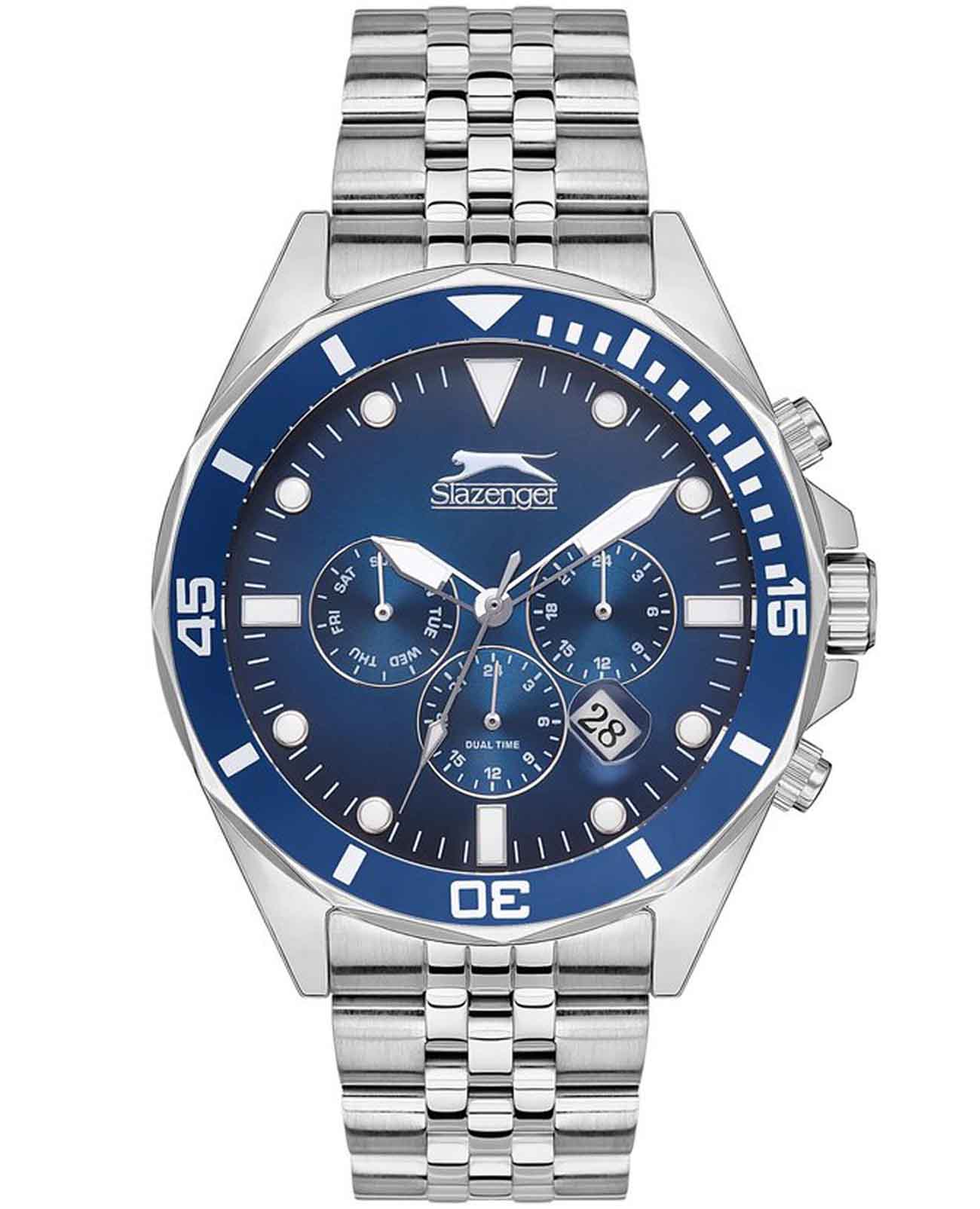 Часы Slazenger SL.09.2130.2.01 воплощают в себе элегантность и практичность, идеально подходящие для современных мужчин. Их синий циферблат, защищенный минеральным стекломМинеральное стеклоМинеральное стекло представляет собой искусственно выращенный минерал кварца. Такое стекло отличается особой устойчивостью к повреждениям и царапинам. Уступает по некоторым качествам сапфировому стеклу., заключен в серебристый корпус диаметром 46 мм, который изготовлен из прочного суперметалла. Часы оснащены двойным форматом времени (12 и 24 часа), вторым часовым поясом и удобным окошком даты. Надежный кварцевый механизм обеспечивает точность, а водозащита 5 ATM делает их устойчивыми к воздействию воды. Стальной браслет из суперметалла имеет раскладную застёжкуРаскладная застёжкаТакой тип застёжки используется только на браслетах из металла. Она никогда не раскрывается полностью, происходит разделение на 2 и более частей. Раскладывающая застёжка снизит вероятность потери часов к минимуму., что подчеркивает современный стиль и позволяет легко снимать часы. Часы оснащены 24-часовым указателем времени, а также функциями отображения даты и дня недели. Люминесцентное покрытиеЛюминесцентное покрытиеПозволяет считывать показания времени в темноте. Производители наносят на стрелки, часовые индексы, безель или поверхность циферблата светонакопительный состав, дающий холодное свечение. на стрелках и метках обеспечивает отличную видимость в темноте.