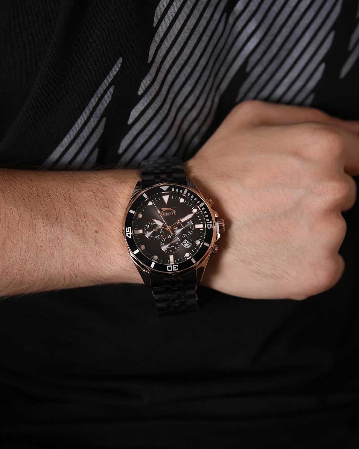 Часы Slazenger SL.09.2130.2.03 воплощают в себе элегантность и практичность, идеально подходящие для современных мужчин. Их черный циферблат, защищенный минеральным стекломМинеральное стеклоМинеральное стекло представляет собой искусственно выращенный минерал кварца. Такое стекло отличается особой устойчивостью к повреждениям и царапинам. Уступает по некоторым качествам сапфировому стеклу., заключен в золотистый корпус диаметром 46 мм, который изготовлен из прочного суперметалла с IP-покрытиемIP-покрытиеМетод ионного напыления. Демонстрирует повышенную устойчивость к истиранию, окислению и химическим веществам. Под воздействием высокого давления и температуры около 1500°C молекулы металла надёжно соединяются с частицами корпуса часов. . Часы оснащены двойным форматом времени (12 и 24 часа), вторым часовым поясом и удобным окошком даты. Надежный кварцевый механизм обеспечивает точность, а водозащита 5 ATM делает их устойчивыми к воздействию воды. Стальной браслет из суперметалла с IP-покрытиемIP-покрытиеМетод ионного напыления. Демонстрирует повышенную устойчивость к истиранию, окислению и химическим веществам. Под воздействием высокого давления и температуры около 1500°C молекулы металла надёжно соединяются с частицами корпуса часов. черного цвета имеет раскладную застёжкуРаскладная застёжкаТакой тип застёжки используется только на браслетах из металла. Она никогда не раскрывается полностью, происходит разделение на 2 и более частей. Раскладывающая застёжка снизит вероятность потери часов к минимуму., что подчеркивает современный стиль и позволяет легко снимать часы. Часы оснащены 24-часовым указателем времени, а также функциями отображения даты и дня недели. Люминесцентное покрытиеЛюминесцентное покрытиеПозволяет считывать показания времени в темноте. Производители наносят на стрелки, часовые индексы, безель или поверхность циферблата светонакопительный состав, дающий холодное свечение. на стрелках и метках обеспечивает отличную видимость в темноте.