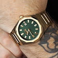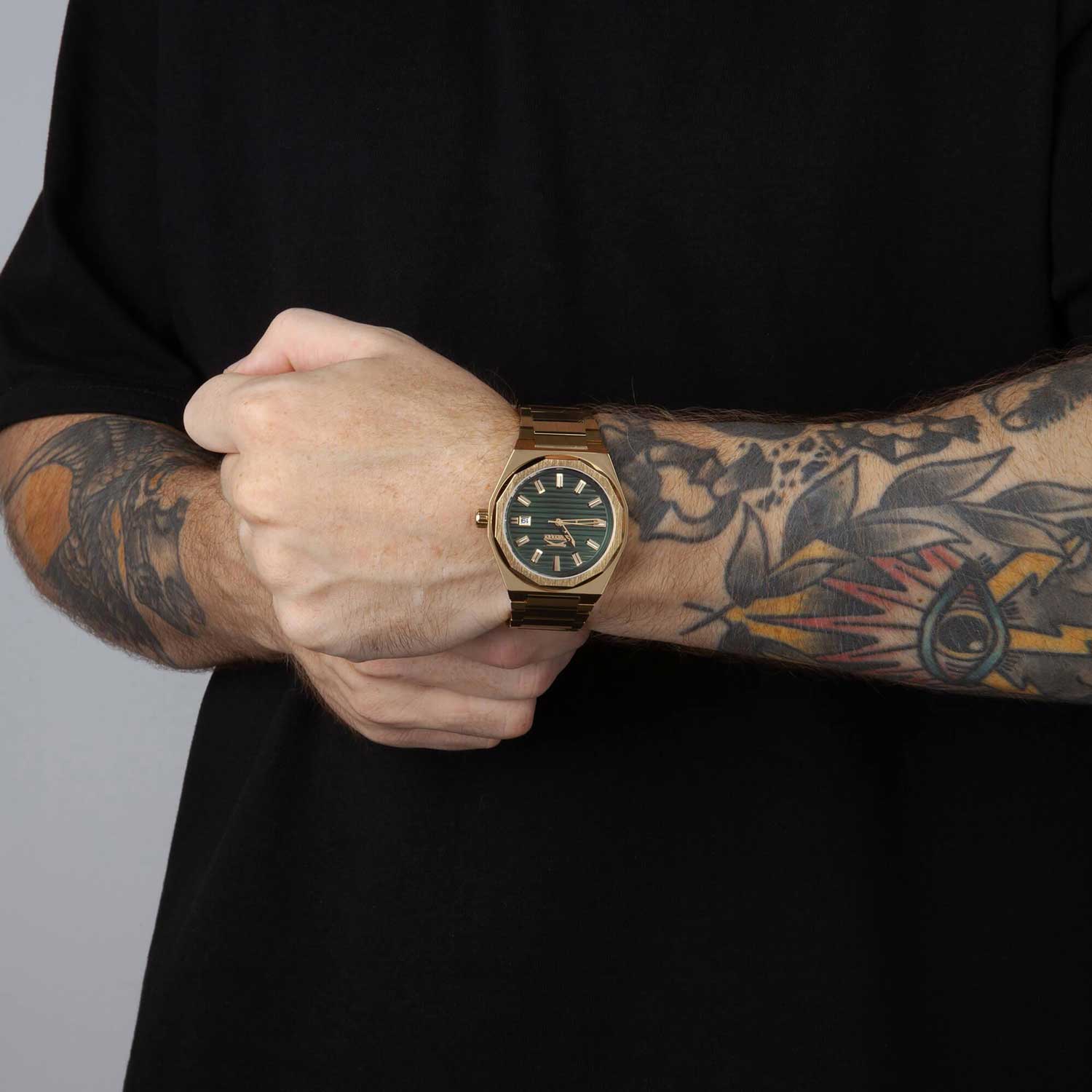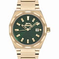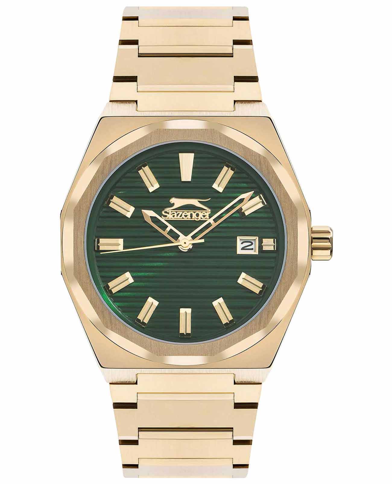 Часы Slazenger SL.09.2143.1.03 воплощают в себе элегантность и практичность, идеально подходящие для современных мужчин. Их зеленый циферблат защищен минеральным стекломМинеральное стеклоМинеральное стекло представляет собой искусственно выращенный минерал кварца. Такое стекло отличается особой устойчивостью к повреждениям и царапинам. Уступает по некоторым качествам сапфировому стеклу. и заключен в золотистый корпус диаметром 41,5 мм, который изготовлен из прочного суперметалла  с IP-покрытиемIP-покрытиеМетод ионного напыления. Демонстрирует повышенную устойчивость к истиранию, окислению и химическим веществам. Под воздействием высокого давления и температуры около 1500°C молекулы металла надёжно соединяются с частицами корпуса часов.. Окошко даты расположено в положении 3 часов. Надежный кварцевый механизм обеспечивает точность, а водозащита 5 ATM делает их устойчивыми к воздействию воды. Браслет из суперметалла с IP-покрытиемIP-покрытиеМетод ионного напыления. Демонстрирует повышенную устойчивость к истиранию, окислению и химическим веществам. Под воздействием высокого давления и температуры около 1500°C молекулы металла надёжно соединяются с частицами корпуса часов. имеет раскладную застёжкуРаскладная застёжкаТакой тип застёжки используется только на браслетах из металла. Она никогда не раскрывается полностью, происходит разделение на 2 и более частей. Раскладывающая застёжка снизит вероятность потери часов к минимуму., что подчеркивает современный стиль и позволяет легко снимать часы. Ширина браслета 22-26 мм.