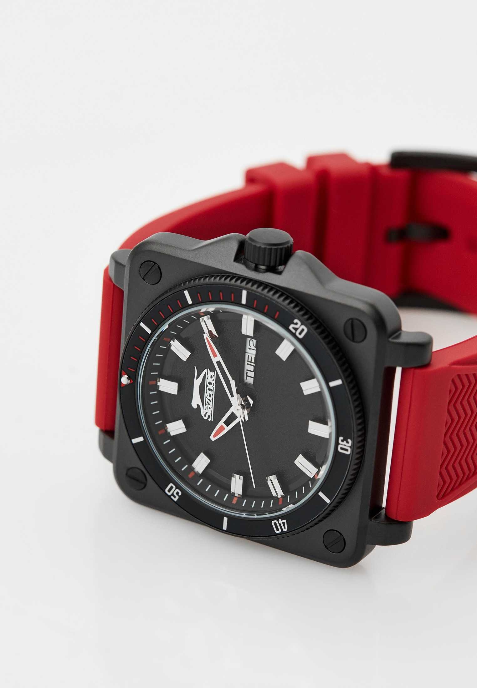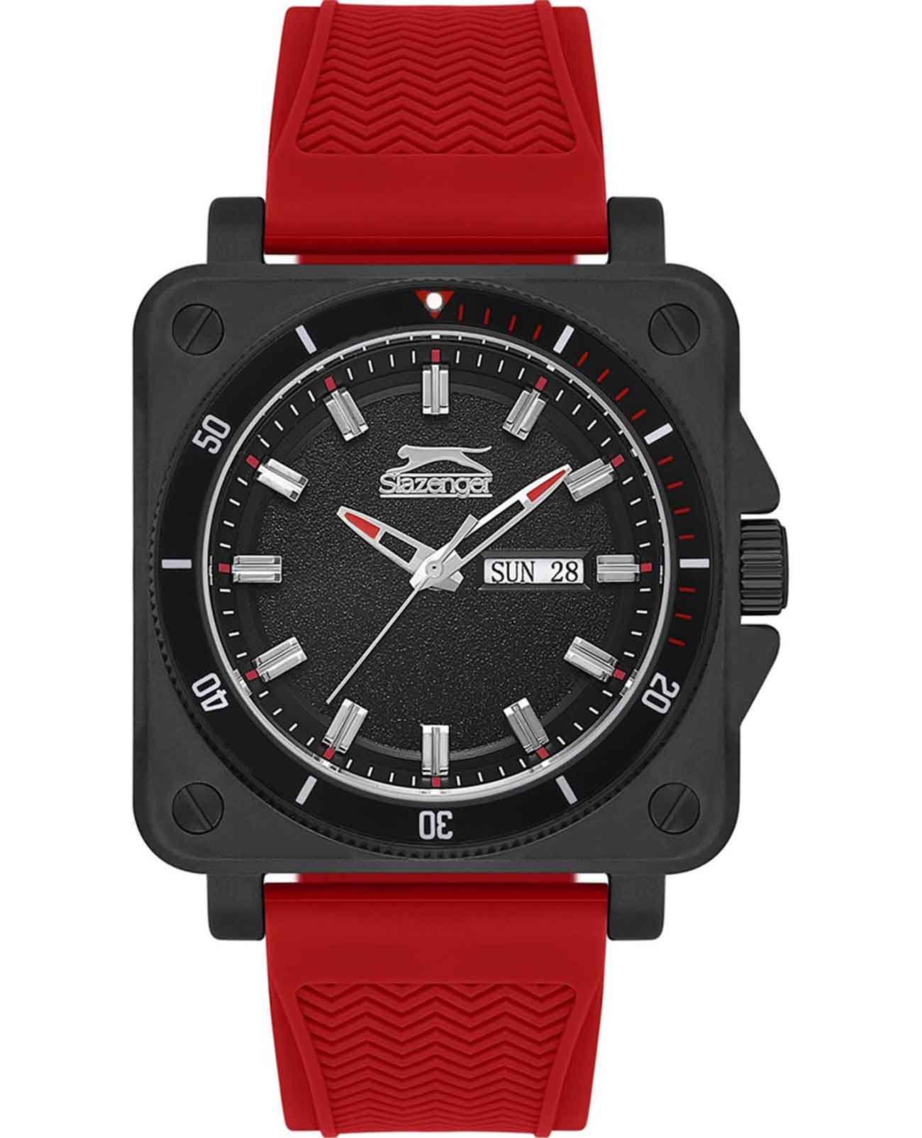 Часы Slazenger SL.09.2233.1.05 — это современная модель, сочетающая стиль и практичность. Корпус квадратной формы выполнен из прочного металла с черным IP-покрытиемIP-покрытиеМетод ионного напыления. Демонстрирует повышенную устойчивость к истиранию, окислению и химическим веществам. Под воздействием высокого давления и температуры около 1500°C молекулы металла надёжно соединяются с частицами корпуса часов., а круглый красный циферблат придает дизайну особую выразительность. На вращающийся безельБезельВнешний ободок, закрепляющий стекло. В спортивных часах так называется поворотное кольцо с делениями на циферблате, выполняет роль таймера – замеряет отрезки времени на шкале. Неподвижный безель – элемент декора. Однонаправленно вращающийся безель на дайверских часах позволяет фиксировать моменты погружения и выныривания на поверхность. нанесено черное IP-покрытиеIP-покрытиеМетод ионного напыления. Демонстрирует повышенную устойчивость к истиранию, окислению и химическим веществам. Под воздействием высокого давления и температуры около 1500°C молекулы металла надёжно соединяются с частицами корпуса часов.. Резиновый красный ремешок с классической застежкой обеспечивает удобство при повседневном ношении. Модель оснащена кварцевым механизмом, минеральное стеклоМинеральное стеклоМинеральное стекло представляет собой искусственно выращенный минерал кварца. Такое стекло отличается особой устойчивостью к повреждениям и царапинам. Уступает по некоторым качествам сапфировому стеклу., защищающим от случайных повреждений, и водозащитой уровня WR 50, позволяющей не бояться контакта с водой в повседневных ситуациях. На циферблате расположены окошки даты и дня недели. Для удобства использования в темное время суток предусмотрено люминесцентное покрытиеЛюминесцентное покрытиеПозволяет считывать показания времени в темноте. Производители наносят на стрелки, часовые индексы, безель или поверхность циферблата светонакопительный состав, дающий холодное свечение. стрелок. Заводная головка дополнительно защищена от случайных нажатий. Габариты корпуса составляют 43 на 43 мм, толщина — 11 мм.