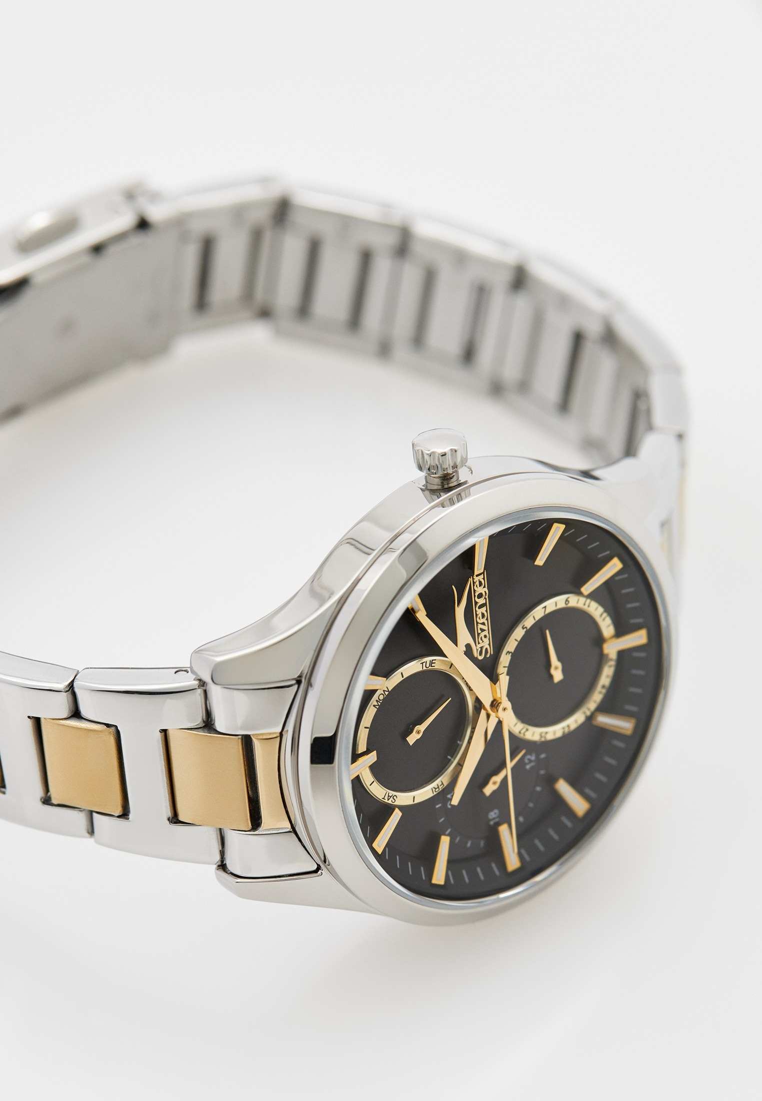 Часы Slazenger SL.09.2284.4.04 — это изящный и функциональный аксессуар, который гармонично дополнит ваш образ и подчеркнет индивидуальность. Корпус и браслет выполнены из инновационного суперметалла — сплава на основе меди с пониженным содержанием цинка и никеля, что обеспечивает долговечность и надежную защиту от внешних воздействий. Черный циферблат, защищенный прочным минеральным стекломМинеральное стеклоМинеральное стекло представляет собой искусственно выращенный минерал кварца. Такое стекло отличается особой устойчивостью к повреждениям и царапинам. Уступает по некоторым качествам сапфировому стеклу., оснащен дополнительными индикаторами: отдельные циферблаты отображают 24-часовой формат времени, текущую дату и день недели, что делает использование часов максимально удобным в повседневной жизни. Диаметр корпуса составляет 35 мм, а толщина — 11 мм, благодаря чему модель комфортно располагается на запястье. Браслет с частичным золотистым IP-покрытиемIP-покрытиеМетод ионного напыления. Демонстрирует повышенную устойчивость к истиранию, окислению и химическим веществам. Под воздействием высокого давления и температуры около 1500°C молекулы металла надёжно соединяются с частицами корпуса часов. и раскладной застёжкойРаскладная застёжкаТакой тип застёжки используется только на браслетах из металла. Она никогда не раскрывается полностью, происходит разделение на 2 и более частей. Раскладывающая застёжка снизит вероятность потери часов к минимуму. обеспечивает комфортную посадку. Метки с люминесцентным покрытиемЛюминесцентное покрытиеПозволяет считывать показания времени в темноте. Производители наносят на стрелки, часовые индексы, безель или поверхность циферблата светонакопительный состав, дающий холодное свечение. удобно подсвечиваются в темноте после зарядки на свету. Класс водонепроницаемости 3 атм защищает механизм от случайных брызг и капель дождя. Кварцевый механизм гарантирует точность хода и простоту эксплуатации.