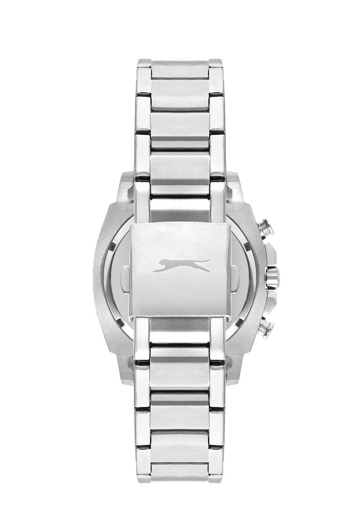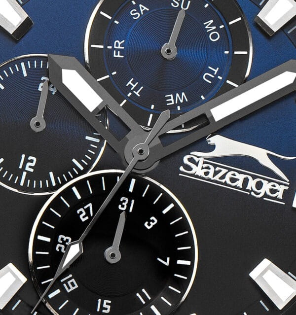 Slazenger SL.09.2292.2.01 — это стильные наручные часы, выполненные в современном дизайне и отлично подходящие для повседневного использования. Корпус диаметром 45 мм изготовлен из прочного металла и дополнен минеральным стекломМинеральное стеклоМинеральное стекло представляет собой искусственно выращенный минерал кварца. Такое стекло отличается особой устойчивостью к повреждениям и царапинам. Уступает по некоторым качествам сапфировому стеклу., которое защищает сине-черный циферблат. Серебристый металлический браслет шириной 24 мм оснащён надежной раскладной застёжкойРаскладная застёжкаТакой тип застёжки используется только на браслетах из металла. Она никогда не раскрывается полностью, происходит разделение на 2 и более частей. Раскладывающая застёжка снизит вероятность потери часов к минимуму., которая обеспечивает комфортную посадку на руке. Кварцевый механизм гарантирует точный ход, а водозащита уровня WR 50 позволяет не снимать часы во время мытья рук или под дождём. Модель оснащена люминесцентным покрытиемЛюминесцентное покрытиеПозволяет считывать показания времени в темноте. Производители наносят на стрелки, часовые индексы, безель или поверхность циферблата светонакопительный состав, дающий холодное свечение. стрелок и меток, что облегчает считывание времени в темноте. Дополнительные малые циферблаты отображают дату, день недели и текущее время в 24-часовом формате. Часы также оснащены заводной головкой с защитой и безелемБезельВнешний ободок, закрепляющий стекло. В спортивных часах так называется поворотное кольцо с делениями на циферблате, выполняет роль таймера – замеряет отрезки времени на шкале. Неподвижный безель – элемент декора. Однонаправленно вращающийся безель на дайверских часах позволяет фиксировать моменты погружения и выныривания на поверхность. с черным IP-покрытиемIP-покрытиеМетод ионного напыления. Демонстрирует повышенную устойчивость к истиранию, окислению и химическим веществам. Под воздействием высокого давления и температуры около 1500°C молекулы металла надёжно соединяются с частицами корпуса часов. и секундной разметкой. Вес изделия составляет 173 грамма.