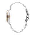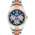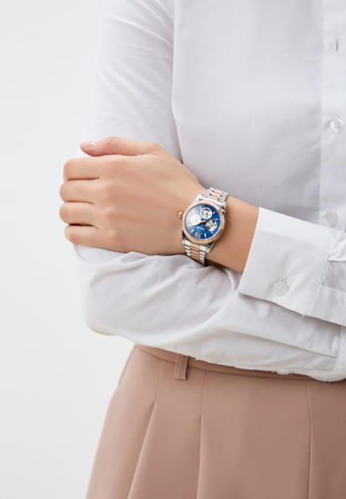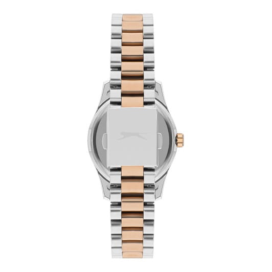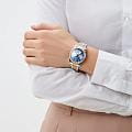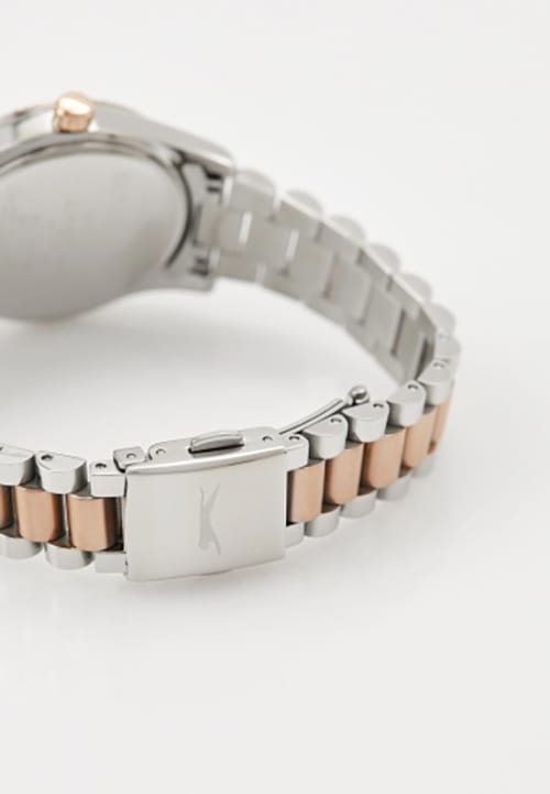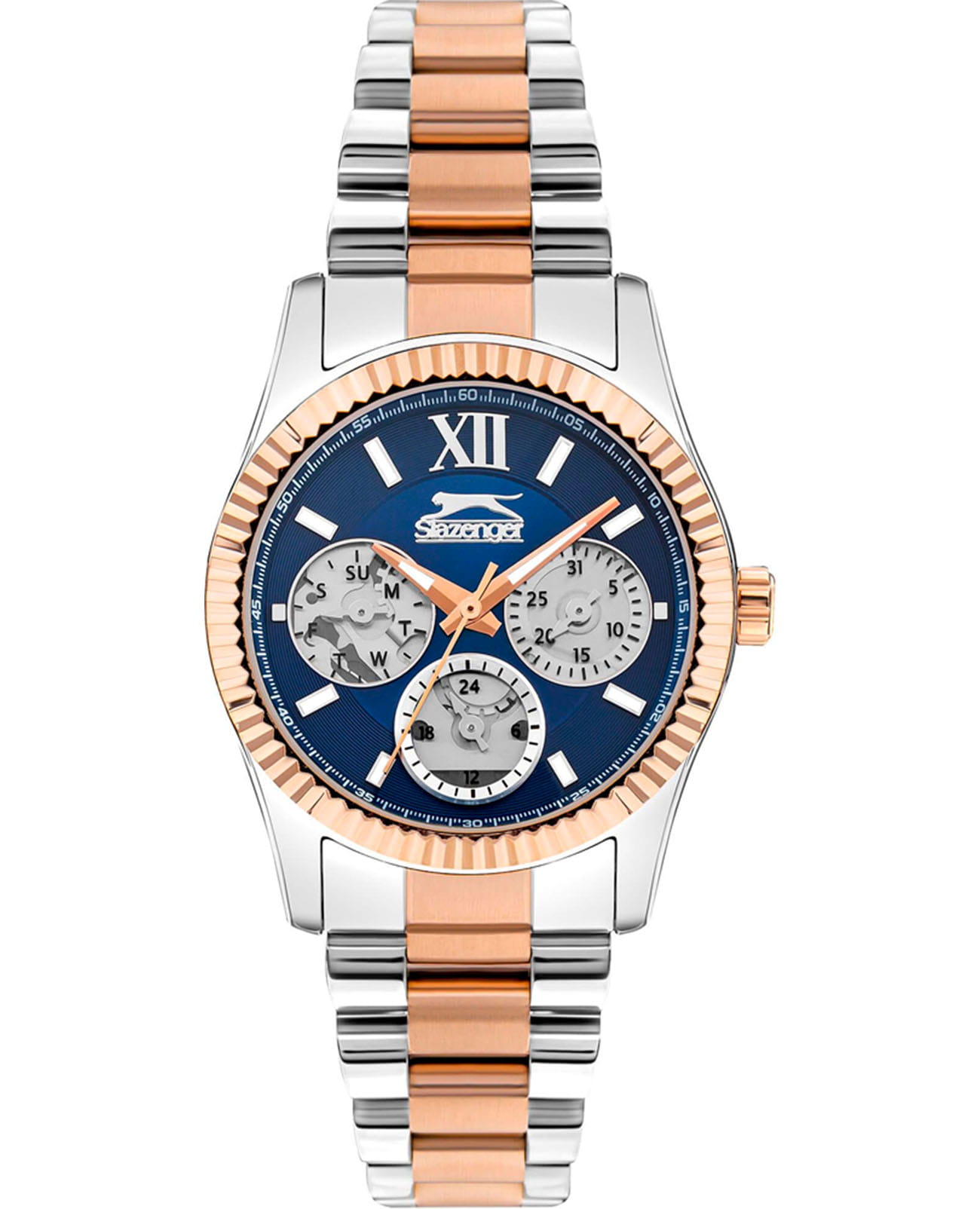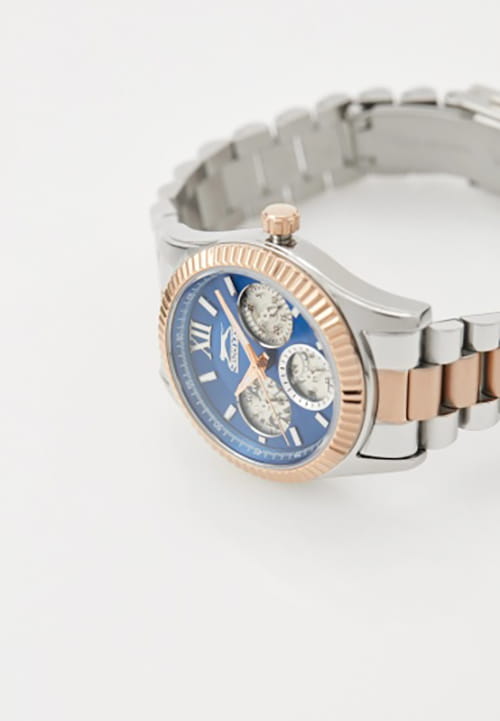 Женские кварцевые часы Slazenger SL.09.2317.4.06 — это выразительный и функциональный аксессуар, сочетающий стиль, прочность и насыщенную комплектацию. Безель и браслет выполнены из суперметалла с частичным IP-покрытиемIP-покрытиеМетод ионного напыления. Демонстрирует повышенную устойчивость к истиранию, окислению и химическим веществам. Под воздействием высокого давления и температуры около 1500°C молекулы металла надёжно соединяются с частицами корпуса часов.. Циферблат синего цвета защищён минеральным стекломМинеральное стеклоМинеральное стекло представляет собой искусственно выращенный минерал кварца. Такое стекло отличается особой устойчивостью к повреждениям и царапинам. Уступает по некоторым качествам сапфировому стеклу. и оформлен с вынесенными малыми циферблатами для индикации дня недели, даты и времени в 24-часовом формате. Стрелки и метки оснащены люминесцентным покрытиемЛюминесцентное покрытиеПозволяет считывать показания времени в темноте. Производители наносят на стрелки, часовые индексы, безель или поверхность циферблата светонакопительный состав, дающий холодное свечение., обеспечивающим хорошую читаемость в темноте. Браслет комбинированного цвета фиксируется на раскладной застёжкеРаскладная застёжкаТакой тип застёжки используется только на браслетах из металла. Она никогда не раскрывается полностью, происходит разделение на 2 и более частей. Раскладывающая застёжка снизит вероятность потери часов к минимуму., обеспечивая удобство и надёжность ношения. Водонепроницаемость 30 м позволяет использовать часы в повседневных условиях, защищая от случайных брызг и капель дождя. Модель подчёркивает индивидуальность владельца и идеально подходит как для повседневного, так и для торжественного образа.