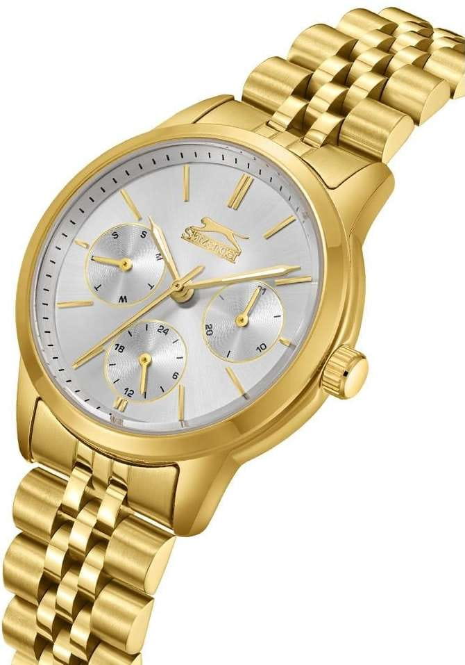Женские элегантные наручные часы Slazenger SL.09.2336.4.06 сочетают в себе современный стиль и функциональность. Корпус выполнен из суперметалла с IP-покрытиемIP-покрытиеМетод ионного напыления. Демонстрирует повышенную устойчивость к истиранию, окислению и химическим веществам. Под воздействием высокого давления и температуры около 1500°C молекулы металла надёжно соединяются с частицами корпуса часов., придающий модели дополнительную прочность и элегантный внешний вид. Изысканный циферблат защищён минеральным стекломМинеральное стеклоМинеральное стекло представляет собой искусственно выращенный минерал кварца. Такое стекло отличается особой устойчивостью к повреждениям и царапинам. Уступает по некоторым качествам сапфировому стеклу., устойчивым к царапинам и повреждениям. Часы оснащены дополнительными циферблатами, отображающими дату, день недели и 24-часовой формат времени, что добавляет практичности в повседневном использовании. Водонепроницаемость 3 АТМ позволяет использовать часы в повседневных условиях — при мытье рук или под лёгким дождём. Браслет из суперметалла с IP-покрытиемIP-покрытиеМетод ионного напыления. Демонстрирует повышенную устойчивость к истиранию, окислению и химическим веществам. Под воздействием высокого давления и температуры около 1500°C молекулы металла надёжно соединяются с частицами корпуса часов. и с раскладной застёжкойРаскладная застёжкаТакой тип застёжки используется только на браслетах из металла. Она никогда не раскрывается полностью, происходит разделение на 2 и более частей. Раскладывающая застёжка снизит вероятность потери часов к минимуму. обеспечивает надёжную фиксацию и комфорт при ношении. Эта модель идеально подходит для женщин, ценящих стиль, функциональность и надёжность в одном аксессуаре.