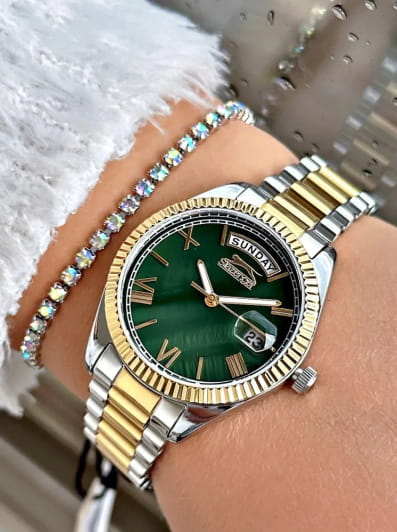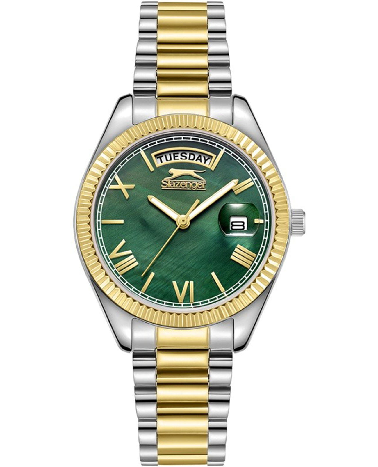 Женские элегантные наручные часы Slazenger SL.09.2338.4.08 сочетают в себе современный стиль и функциональность. Стильный корпус выполнен из суперметалла, а неповоротный безельБезельВнешний ободок, закрепляющий стекло. В спортивных часах так называется поворотное кольцо с делениями на циферблате, выполняет роль таймера – замеряет отрезки времени на шкале. Неподвижный безель – элемент декора. Однонаправленно вращающийся безель на дайверских часах позволяет фиксировать моменты погружения и выныривания на поверхность. с IP-покрытиемIP-покрытиеМетод ионного напыления. Демонстрирует повышенную устойчивость к истиранию, окислению и химическим веществам. Под воздействием высокого давления и температуры около 1500°C молекулы металла надёжно соединяются с частицами корпуса часов., придающий модели дополнительную прочность и элегантный внешний вид. Изысканный циферблат защищён минеральным стекломМинеральное стеклоМинеральное стекло представляет собой искусственно выращенный минерал кварца. Такое стекло отличается особой устойчивостью к повреждениям и царапинам. Уступает по некоторым качествам сапфировому стеклу., устойчивым к царапинам и повреждениям. Водонепроницаемость 3 АТМ позволяет использовать часы в повседневных условиях — при мытье рук или под лёгким дождём. Браслет из суперметалла с частичным IP-покрытиемIP-покрытиеМетод ионного напыления. Демонстрирует повышенную устойчивость к истиранию, окислению и химическим веществам. Под воздействием высокого давления и температуры около 1500°C молекулы металла надёжно соединяются с частицами корпуса часов. и с раскладной застёжкойРаскладная застёжкаТакой тип застёжки используется только на браслетах из металла. Она никогда не раскрывается полностью, происходит разделение на 2 и более частей. Раскладывающая застёжка снизит вероятность потери часов к минимуму., обеспечивающий надёжную фиксацию и комфорт при ношении. Окошко даты находится в положении 3 часа. Cтрелки покрыты люминесцентным покрытиемЛюминесцентное покрытиеПозволяет считывать показания времени в темноте. Производители наносят на стрелки, часовые индексы, безель или поверхность циферблата светонакопительный состав, дающий холодное свечение. для читаемости в условиях недостаточного освещения. Эта модель идеально подходит для женщин, ценящих стиль, функциональность и надёжность в одном аксессуаре.