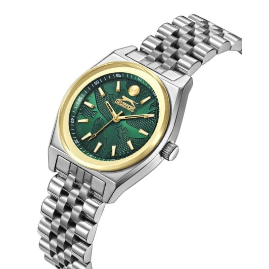 Женские кварцевые часы Slazenger — это элегантный аксессуар, сочетающий стиль и надёжность. Корпус диаметром 32 мм и толщиной 9 мм выполнен из суперметалла с IP-покрытиемIP-покрытиеМетод ионного напыления. Демонстрирует повышенную устойчивость к истиранию, окислению и химическим веществам. Под воздействием высокого давления и температуры около 1500°C молекулы металла надёжно соединяются с частицами корпуса часов.. Циферблат зелёного цвета защищён минеральным стекломМинеральное стеклоМинеральное стекло представляет собой искусственно выращенный минерал кварца. Такое стекло отличается особой устойчивостью к повреждениям и царапинам. Уступает по некоторым качествам сапфировому стеклу.. Механизм — кварцевый калибр VJ21C1. Часы оснащены браслетом из суперметалла с раскладной застёжкойРаскладная застёжкаТакой тип застёжки используется только на браслетах из металла. Она никогда не раскрывается полностью, происходит разделение на 2 и более частей. Раскладывающая застёжка снизит вероятность потери часов к минимуму.. Водонепроницаемость 30 м позволяет использовать часы в повседневных условиях. Гарантия — 12 месяцев. Идеальный выбор для тех, кто ценит классический дизайн и качество.