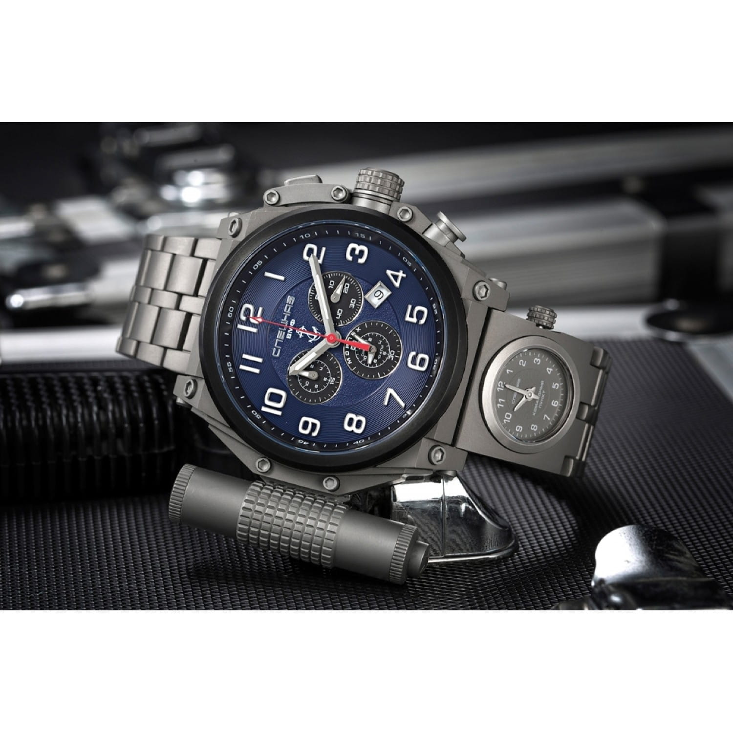 Внутри установлен швейцарский кварцевый механизм Ronda 5130.D, обеспечивающий высокую точность хода. Функции хронографаХронографФункция позволяет измерять отрезки времени с особой точностью: часы, минуты, секунды. Верным признаком хронографа является наличие на циферблате 3 дополнительных окошек-счётчиков. включают секундомер до 12 часов, отображение даты, 24-часовой формат времени и второй часовой пояс, расположенный на браслете.