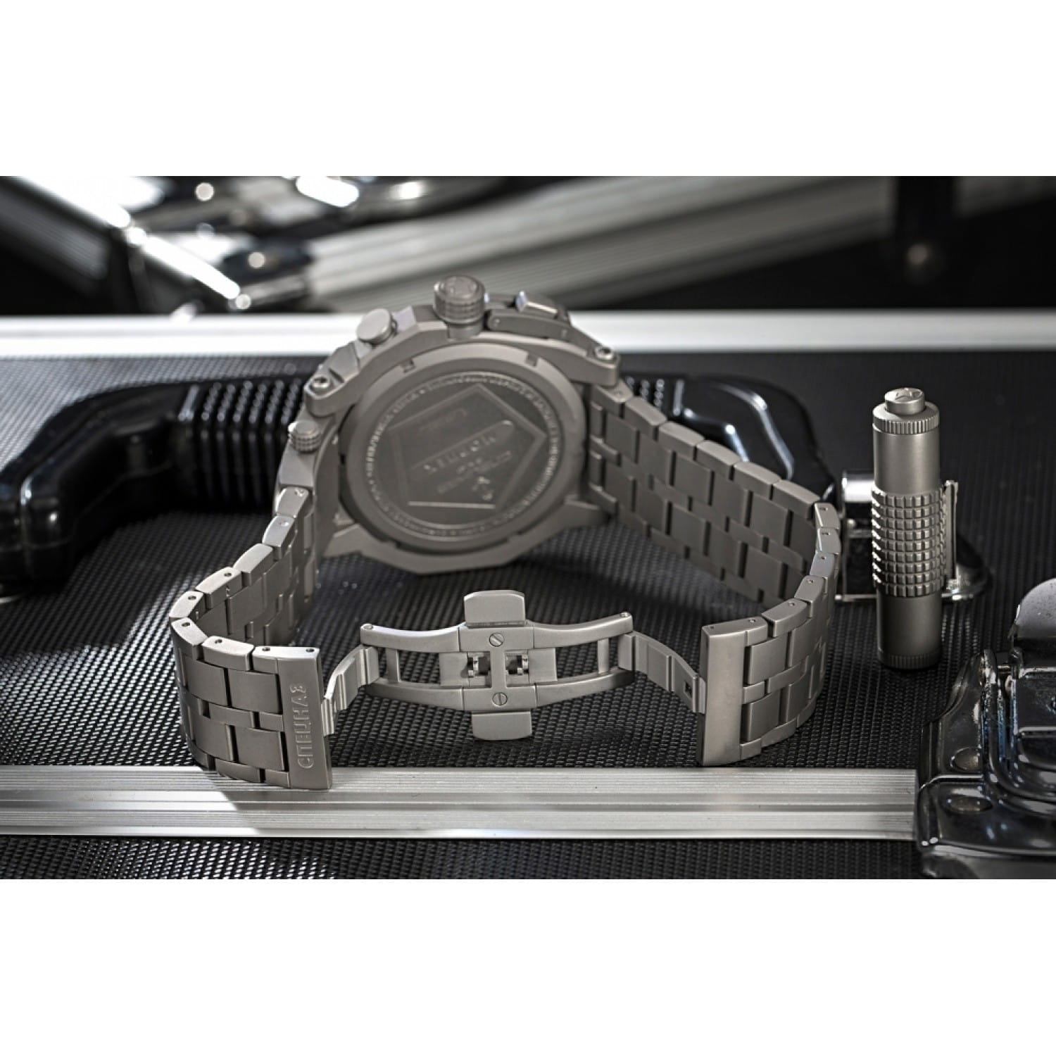 Водозащита 100 метров (10 ATM) позволяет использовать часы для плавания и других водных видов спорта. Титановый браслет с застёжкой бабочкаЗастёжка "бабочка"Такой вид застёжки дополняется предохранителями, помогающими избежать случайного раскрытия браслета. Обладают изящным исполнением. и системой блокировки обеспечивает комфортное ношение и надёжную фиксацию на запястье.