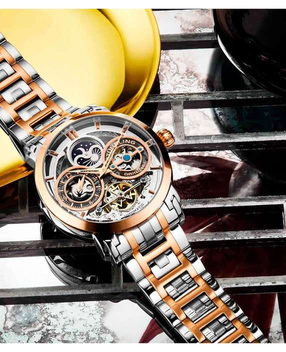 Мужские наручные часы Stührling Original 371B.05 из коллекции Luciano Automatic Skeleton сочетают в себе классический дизайн и современные технологии . Модель оснащена механическим механизмом с автоподзаводом, что гарантирует точность хода без необходимости ручного завода . Корпус часов диаметром 46 мм изготовлен из нержавеющей стали, что подчеркивает элегантность модели . БезельБезельВнешний ободок, закрепляющий стекло. В спортивных часах так называется поворотное кольцо с делениями на циферблате, выполняет роль таймера – замеряет отрезки времени на шкале. Неподвижный безель – элемент декора. Однонаправленно вращающийся безель на дайверских часах позволяет фиксировать моменты погружения и выныривания на поверхность. с PVD-покрытиемPVDУльтратонкое покрытие наносится в технике вакуумного напыления, сочетает в себе нитрид титана особой прочности со слоем золота или оксида хрома. Несёт в себе декоративную или защитную функцию.. Защиту циферблата обеспечивает прочное стекло KrysternaKrysternaKrysterna — инновационное стекло для наручных часов. Благодаря уникальной структуре, Krysterna объединяет ключевые преимущества двух материалов: твердость сапфира, защищающую от царапин, и гибкость минерального стекла, обеспечивающую устойчивость к деформациям. Такая комбинация делает его идеальным решением для часов, подверженных экстремальным нагрузкам, сохраняя при этом оптическую прозрачность., известное своей устойчивостью к царапинам и механическим повреждениям . Циферблат выполнен в стиле , что позволяет наблюдать за работой внутреннего механизма и демонстрирует сложность инженерного решения . Такой дизайн делает модель не только функциональной, но и стильной, привлекая внимание ценителей сложных технических решений. Часы оснащены функцией второго часового поясаВторой часовой поясФункция, позволяющая отображать время двух часовых поясов одновременно. и анимированным индикатором AM/PM в виде солнца и луны, что делает их удобными для путешественников . Водонепроницаемость модели достигает 5 атмосфер (50 метров), что позволяет использовать их в повседневных условиях, включая контакт с водой, например, при мытье рук или дожде . Заводная головка с системой завинчивания обеспечивает дополнительную защиту механизма от внешних воздействий.