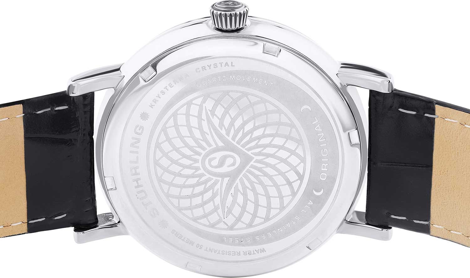 Stuhrling 899.03 — выразительные мужские часы с уникальным дизайнерским решением. Глубокий циферблат с геометрическим узором придаёт модели эффектный и современный вид. Корпус из нержавеющей стали отличается аккуратной полировкой и плавными формами, подчёркивающими элегантность классического стиля. Прочное стекло KrysternaKrysternaKrysterna — инновационное стекло для наручных часов. Благодаря уникальной структуре, Krysterna объединяет ключевые преимущества двух материалов: твердость сапфира, защищающую от царапин, и гибкость минерального стекла, обеспечивающую устойчивость к деформациям. Такая комбинация делает его идеальным решением для часов, подверженных экстремальным нагрузкам, сохраняя при этом оптическую прозрачность. защищает поверхность от царапин, сохраняя прозрачность и глубину цвета. Чёрный ремень из натуральной кожи на стандартной застежке, обеспечивает комфорт и надёжность при ежедневном ношении. Stuhrling — это гармония механической точности и выразительного дизайна, созданная для мужчин, ценящих стиль и совершенство деталей.