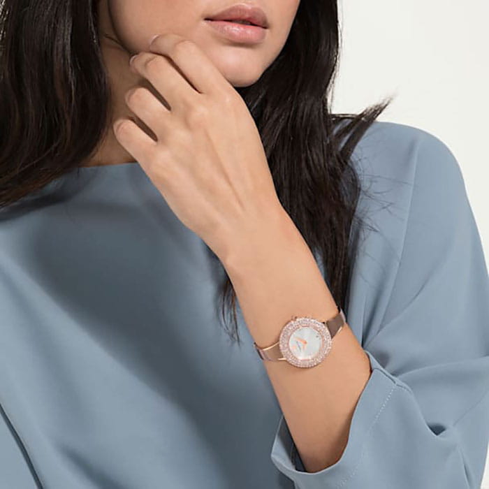Женские часы Swarovski Crystal Rose 5484073 – это элегантные и утончённые часы, отличающиеся непревзойдённым сиянием. БезельБезельВнешний ободок, закрепляющий стекло. В спортивных часах так называется поворотное кольцо с делениями на циферблате, выполняет роль таймера – замеряет отрезки времени на шкале. Неподвижный безель – элемент декора. Однонаправленно вращающийся безель на дайверских часах позволяет фиксировать моменты погружения и выныривания на поверхность. украшен микропаве из 215 кристаллов. Завершающие штрихи уникального дизайна – корпус и браслет из нержавеющей стали с PVDPVDУльтратонкое покрытие наносится в технике вакуумного напыления, сочетает в себе нитрид титана особой прочности со слоем золота или оксида хрома. Несёт в себе декоративную или защитную функцию. покрытием оттенка розового золота и белый циферблат с рисунком в виде солнечных лучей и тремя метками из прозрачных кристаллов. Надежное минеральное стеклоМинеральное стеклоМинеральное стекло представляет собой искусственно выращенный минерал кварца. Такое стекло отличается особой устойчивостью к повреждениям и царапинам. Уступает по некоторым качествам сапфировому стеклу. защищает часы от царапин и долго сохраняет первоначальный внешний вид. Водозащита 50 метров делает часы практичными для повседневного использования.