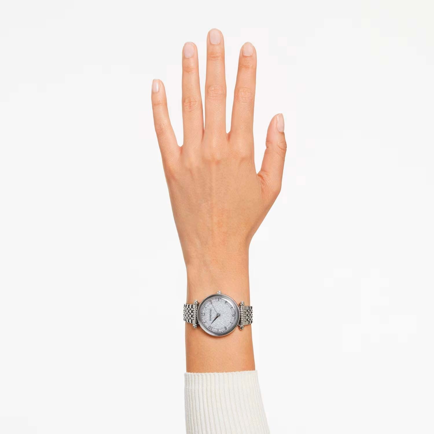 Часы Swarovski 5656929 представляют собой идеальное сочетание роскоши и изысканности, которые подчеркнут вашу индивидуальность и стиль. Эти швейцарские часы оснащены надежным кварцевым механизмом, гарантирующим точность времени. Круглый корпус из нержавеющей стали серебристого цвета создает элегантный и утонченный образ. Под куполообразным минеральным стекломМинеральное стеклоМинеральное стекло представляет собой искусственно выращенный минерал кварца. Такое стекло отличается особой устойчивостью к повреждениям и царапинам. Уступает по некоторым качествам сапфировому стеклу. расположен серебристый циферблат, декорированный примерно тысячью сверкающих кристаллов Swarovski. Метки в виде штрихов и арабских цифр добавляют классический акцент, а граненая заводная головка украшена кристаллом круглой огранки. Стальной браслет обеспечивает комфорт и стиль, а застежка «бабочка»Застёжка "бабочка"Такой вид застёжки дополняется предохранителями, помогающими избежать случайного раскрытия браслета. Обладают изящным исполнением. гарантирует надежную фиксацию на запястье. Водозащита 50WR позволяет носить часы в различных условиях, защищая их от воздействия влаги. С диаметром корпуса 35 мм и длиной ремешка 16,5 см, эти часы идеально подходят для любого случая, создавая выразительный и эффектный образ.