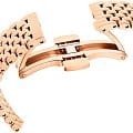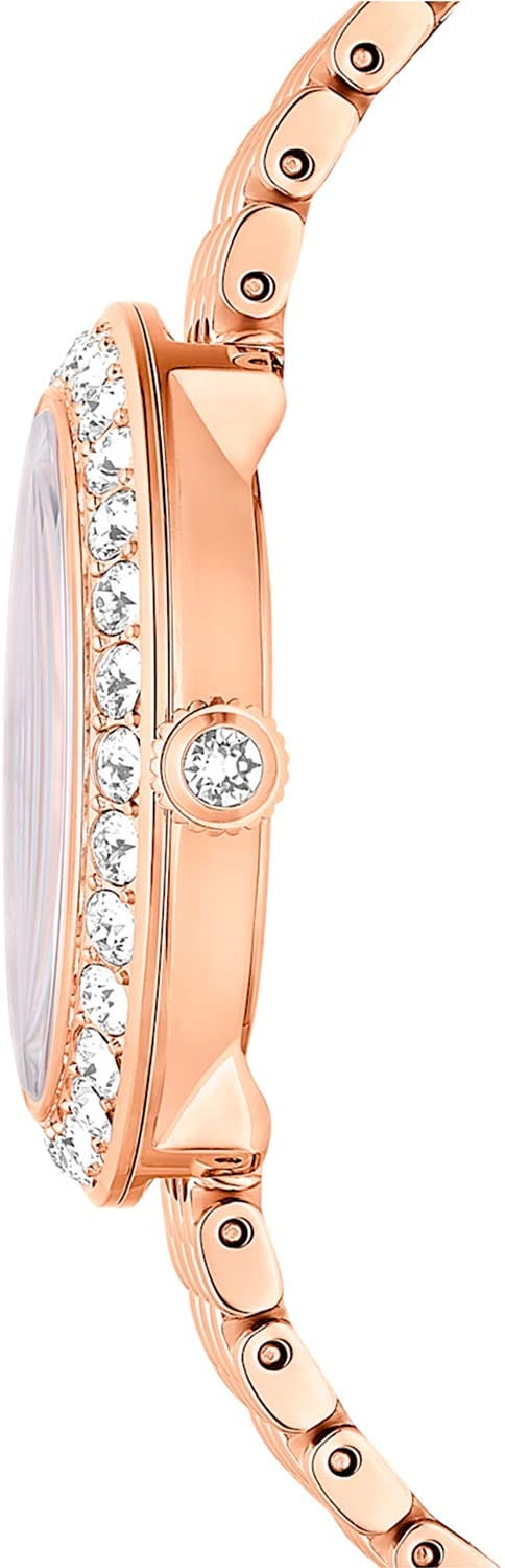 Часы Swarovski 5672981 – это воплощение изысканного дизайна и функциональности, созданное для тех, кто ценит красоту и точность. Стальной круглый корпус имеет красивую отделку PVDPVDУльтратонкое покрытие наносится в технике вакуумного напыления, сочетает в себе нитрид титана особой прочности со слоем золота или оксида хрома. Несёт в себе декоративную или защитную функцию. покрытием оттенка розового золота и оснащен безелемБезельВнешний ободок, закрепляющий стекло. В спортивных часах так называется поворотное кольцо с делениями на циферблате, выполняет роль таймера – замеряет отрезки времени на шкале. Неподвижный безель – элемент декора. Однонаправленно вращающийся безель на дайверских часах позволяет фиксировать моменты погружения и выныривания на поверхность., украшенным паве из тридцати мерцающих кристаллов. Под минеральным стекломМинеральное стеклоМинеральное стекло представляет собой искусственно выращенный минерал кварца. Такое стекло отличается особой устойчивостью к повреждениям и царапинам. Уступает по некоторым качествам сапфировому стеклу. открывается белый циферблат дополненный логотипом Swarovski в виде лебедя на 12 часах и кристаллами на отметках 3, 6 и 9 часов. Отсутствие секундной стрелки подчеркивает минимализм и утонченность дизайна. Рифленая заводная головка также украшена сверкающим кристаллом круглой огранки. Стальной браслет с отделкой PVDPVDУльтратонкое покрытие наносится в технике вакуумного напыления, сочетает в себе нитрид титана особой прочности со слоем золота или оксида хрома. Несёт в себе декоративную или защитную функцию. покрытием цвета розового золота и застежкой «бабочка»Застёжка "бабочка"Такой вид застёжки дополняется предохранителями, помогающими избежать случайного раскрытия браслета. Обладают изящным исполнением. . Водозащита 50WR делает их устойчивыми к влаге, позволяя наслаждаться стильным аксессуаром в любых условиях.