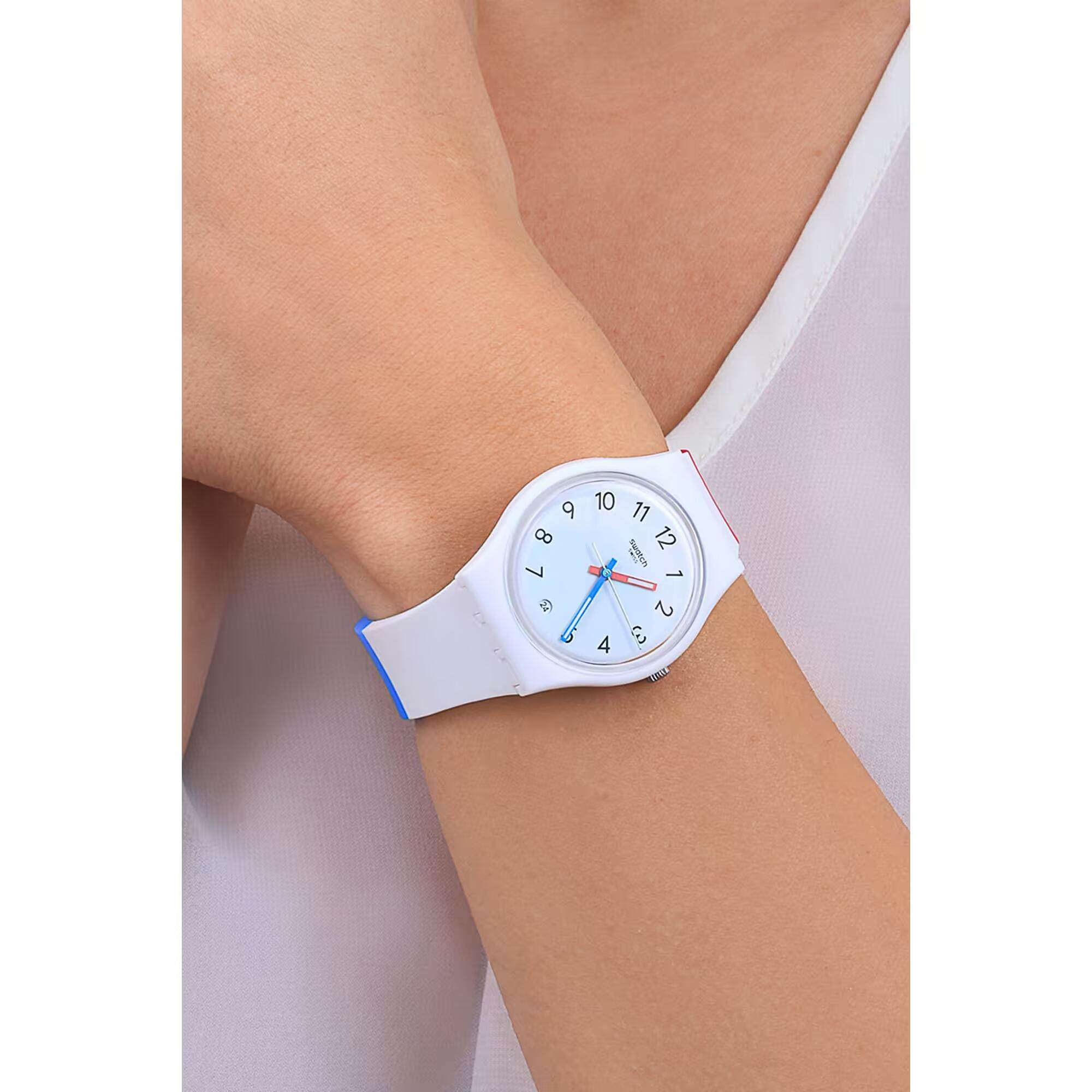 Часы Swatch SO28W400 — это стильный и современный аксессуар, который идеально подходит для повседневного ношения. Часы имеют белый корпус из биоматериала и белый циферблат с черными цифрами и окошком даты в положении "6 часов". Стрелки со светящимися в темноте кончиками с люминесцентным покрытиемЛюминесцентное покрытиеПозволяет считывать показания времени в темноте. Производители наносят на стрелки, часовые индексы, безель или поверхность циферблата светонакопительный состав, дающий холодное свечение. помогают ориентироваться ночью. Стекло часов изготовлено из многослойного акрила, устойчивого к царапинам и ударам. Ремешок часов сине-бело-красного цвета выполнен из силикона и имеет регулируемую длину, на классической застежке. Внутри часов установлен надежный кварцевый механизм, который обеспечивает точность хода. Эти часы водонепроницаемы до 30 метров, что позволяет не беспокоиться о случайных брызгах или дождевых каплях. Swatch SO28W400 — это идеальный выбор для тех, кто ценит сочетание стиля, комфорта и функциональности в одном аксессуаре.
