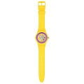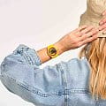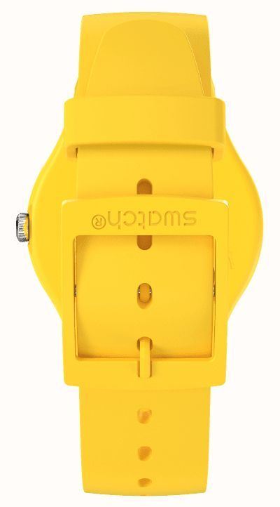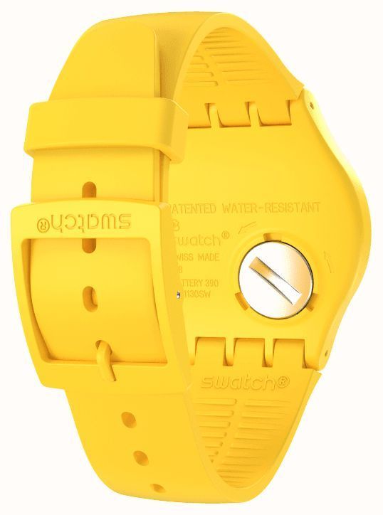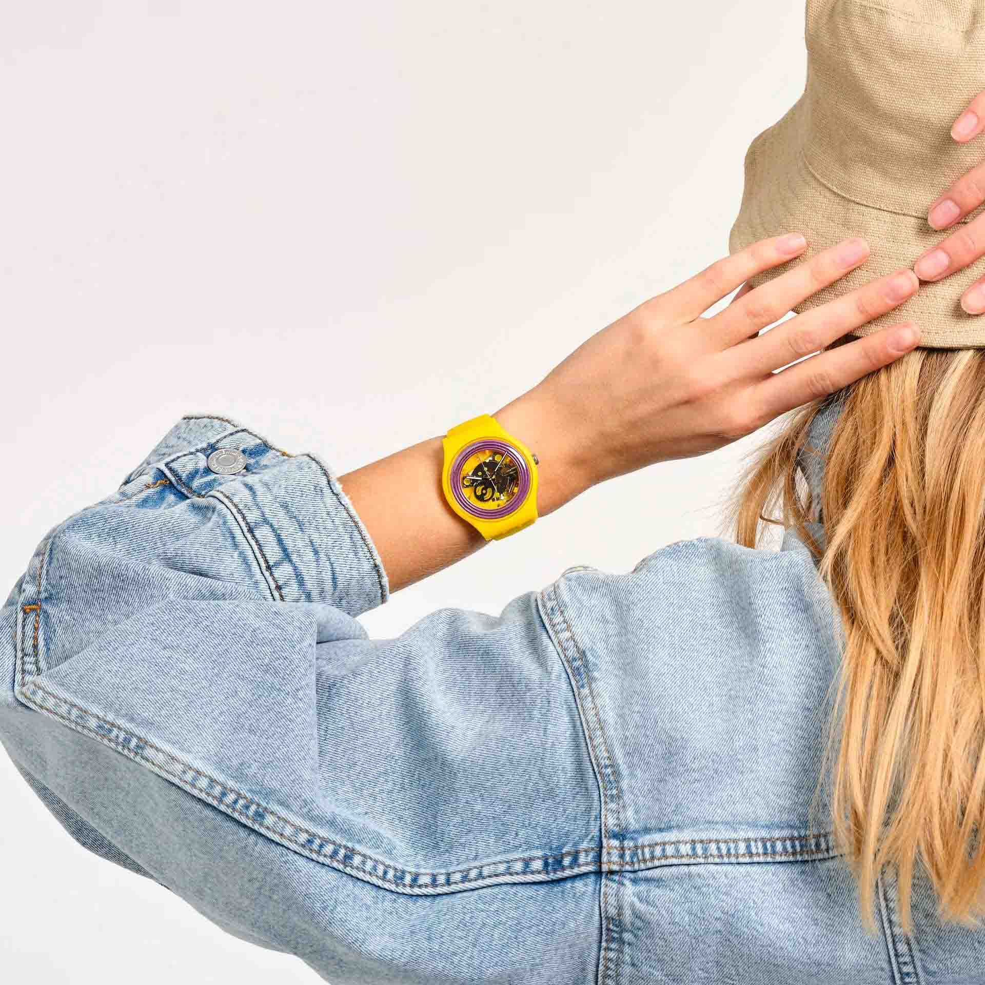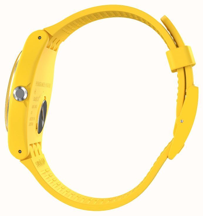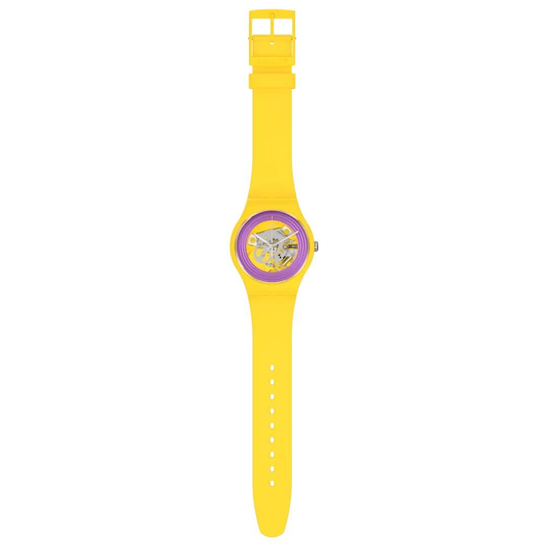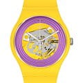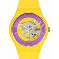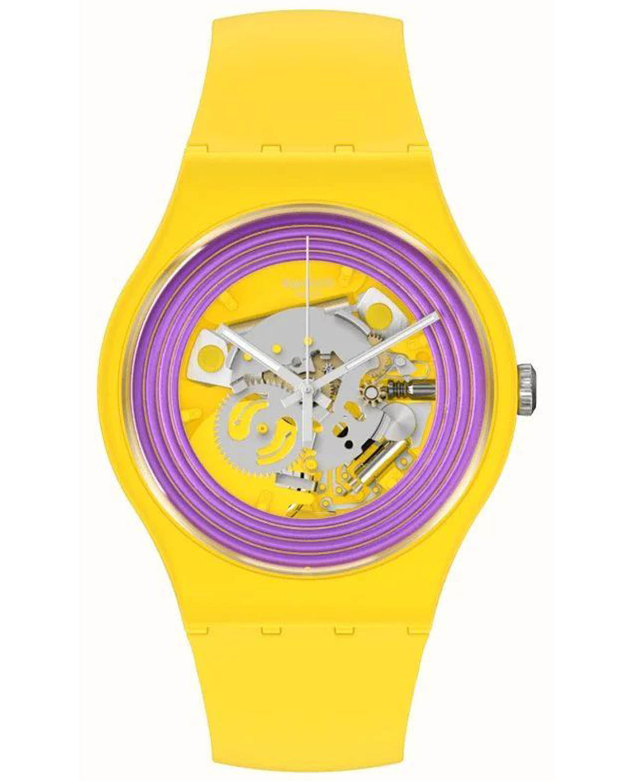 Часы Swatch SO29J100 —  эффектный и надежный аксессуар. Желтый силиконовый ремешок и корпус этих часов NEW GENT BIOSOURCED контрастируют с циферблатом, который имеет стекло из биоматериала, фиолетовое кольцо и стрелки с люминесцентным покрытиемЛюминесцентное покрытиеПозволяет считывать показания времени в темноте. Производители наносят на стрелки, часовые индексы, безель или поверхность циферблата светонакопительный состав, дающий холодное свечение.. Циферблат прозрачный, позволяет наблюдать механизм часов. Ремешок на стандартной застёжке. Внутри часов установлен надежный кварцевый механизм, который обеспечивает точность хода. Эти часы водонепроницаемы до 30 метров, что позволяет не беспокоиться о случайных брызгах или дождевых каплях. Swatch SO29J100 — это идеальный выбор для тех, кто ценит сочетание стиля, комфорта и функциональности в одном аксессуаре.