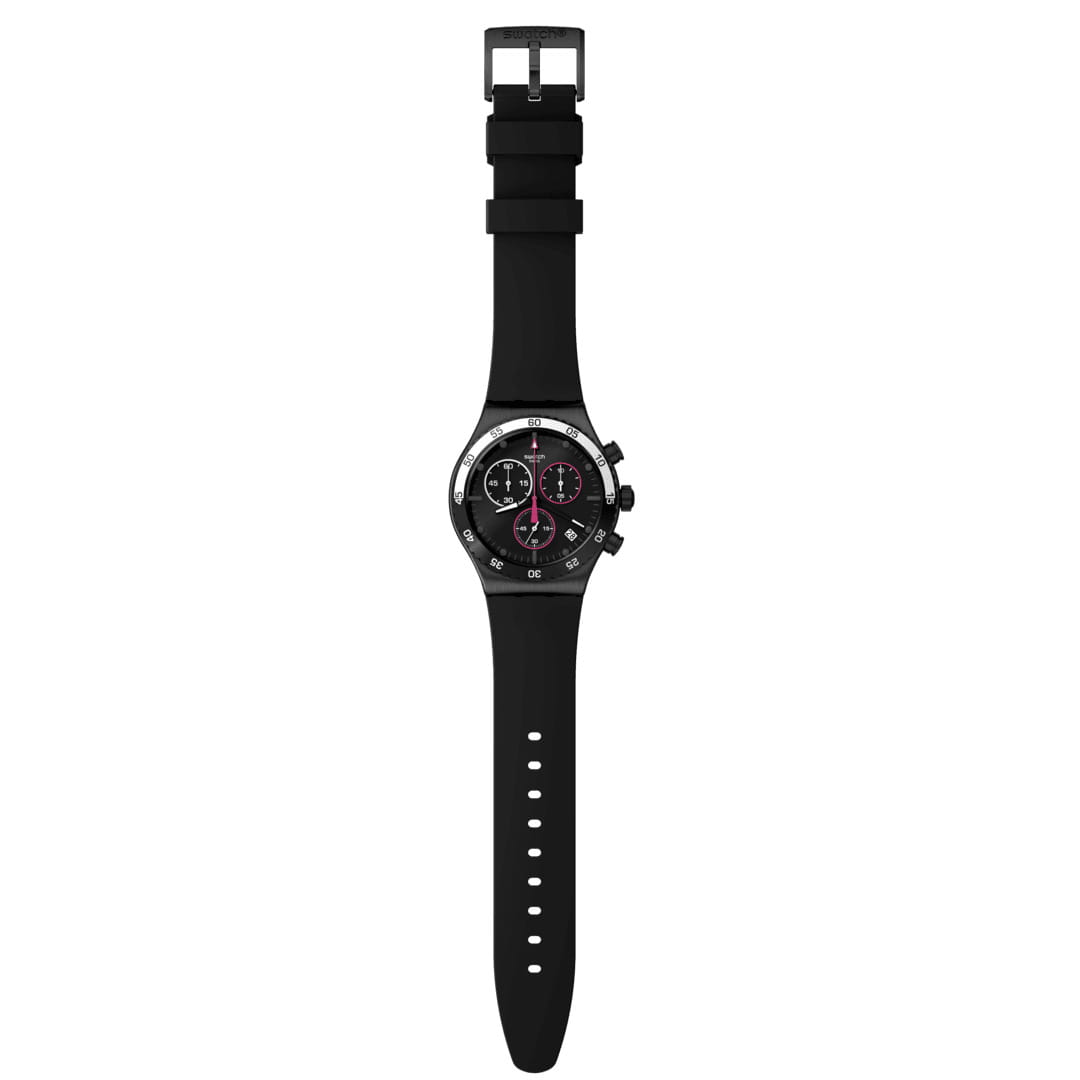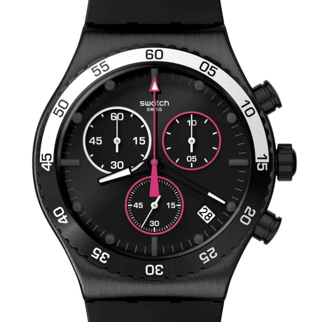 Часы Swatch YVB413 — это стильный и современный аксессуар для тех, кто ценит лёгкость и комфорт. Этот стильный хронографХронографФункция позволяет измерять отрезки времени с особой точностью: часы, минуты, секунды. Верным признаком хронографа является наличие на циферблате 3 дополнительных окошек-счётчиков. из нержавеющей стали с PVDPVDУльтратонкое покрытие наносится в технике вакуумного напыления, сочетает в себе нитрид титана особой прочности со слоем золота или оксида хрома. Несёт в себе декоративную или защитную функцию. покрытием имеет безельБезельВнешний ободок, закрепляющий стекло. В спортивных часах так называется поворотное кольцо с делениями на циферблате, выполняет роль таймера – замеряет отрезки времени на шкале. Неподвижный безель – элемент декора. Однонаправленно вращающийся безель на дайверских часах позволяет фиксировать моменты погружения и выныривания на поверхность. матовый корпус и блестящий черный циферблат, на фоне которого ярко выделяется розовая секундная стрелка и светящиеся в темноте элементы благодаря люминесцентному покрытиюЛюминесцентное покрытиеПозволяет считывать показания времени в темноте. Производители наносят на стрелки, часовые индексы, безель или поверхность циферблата светонакопительный состав, дающий холодное свечение.. Каучуковый ремешок делает эти часы настоящей классикой. Водозащита 30 метров делает часы практичными для повседневного использования. Эти часы подойдут для повседневного ношения и станут ярким акцентом в вашем наряде.