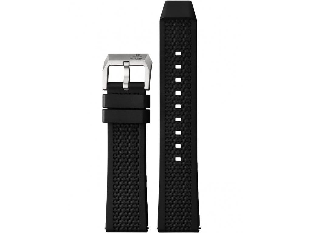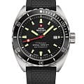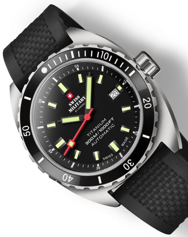 Мужские швейцарские механические часы с автоподзаводом Swiss Military by Chrono Titanium 300 SMA34100.06. Сапфировое стеклоСапфировое стеклоПрочный и надёжный материал из кристалла сапфира синтетического происхождения, характеризующийся особой твёрдостью и устойчивостью к царапинам и повреждениям. устойчивое к появлению царапин, обладающее высокой прозрачностью. Корпус часов изготовлен из титана. Вращающийся безельБезельВнешний ободок, закрепляющий стекло. В спортивных часах так называется поворотное кольцо с делениями на циферблате, выполняет роль таймера – замеряет отрезки времени на шкале. Неподвижный безель – элемент декора. Однонаправленно вращающийся безель на дайверских часах позволяет фиксировать моменты погружения и выныривания на поверхность. из высокотехнологичной керамикиВысокотехнологичная керамикаИнновационный запатентованный Rado материал с гладкой или матовой поверхностью. Керамика за счёт кристаллической структуры обладает повышенной устойчивостью от возникновения царапин. Материал способен принимать температуру тела человека, обеспечивая невероятный комфорт при ношении.. Индикация даты на позиции трех часов. Стрелки и метки с люминесцентной подсветкойЛюминесцентное покрытиеПозволяет считывать показания времени в темноте. Производители наносят на стрелки, часовые индексы, безель или поверхность циферблата светонакопительный состав, дающий холодное свечение.. Класс водозащиты: 300 метров, позволит плавать, нырять и заниматься другими водными видами спорта. Силиконовый браслет на раскладной застёжкеРаскладная застёжкаТакой тип застёжки используется только на браслетах из металла. Она никогда не раскрывается полностью, происходит разделение на 2 и более частей. Раскладывающая застёжка снизит вероятность потери часов к минимуму..