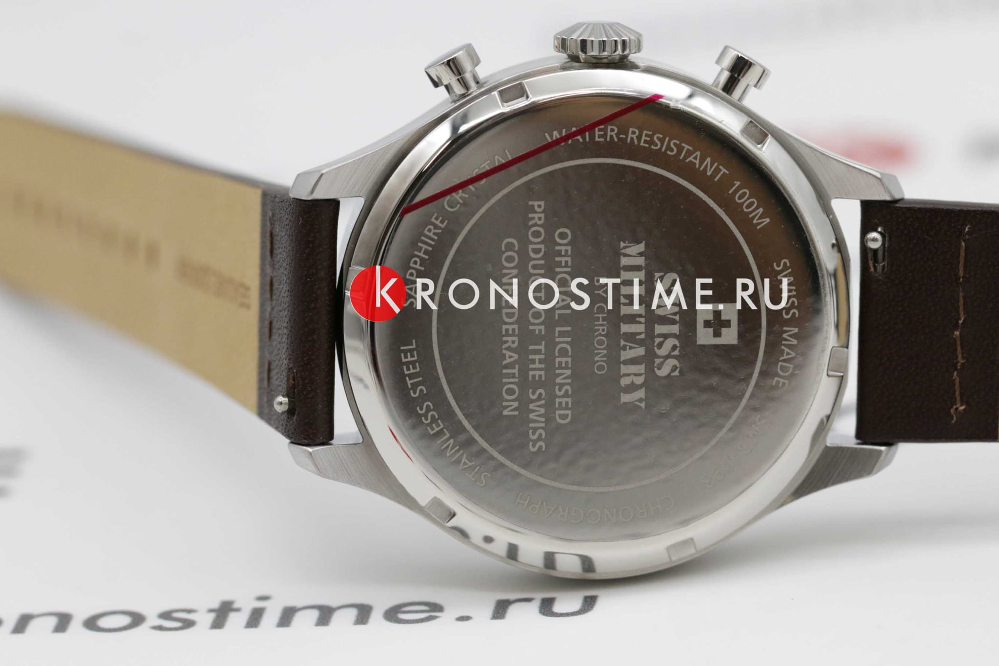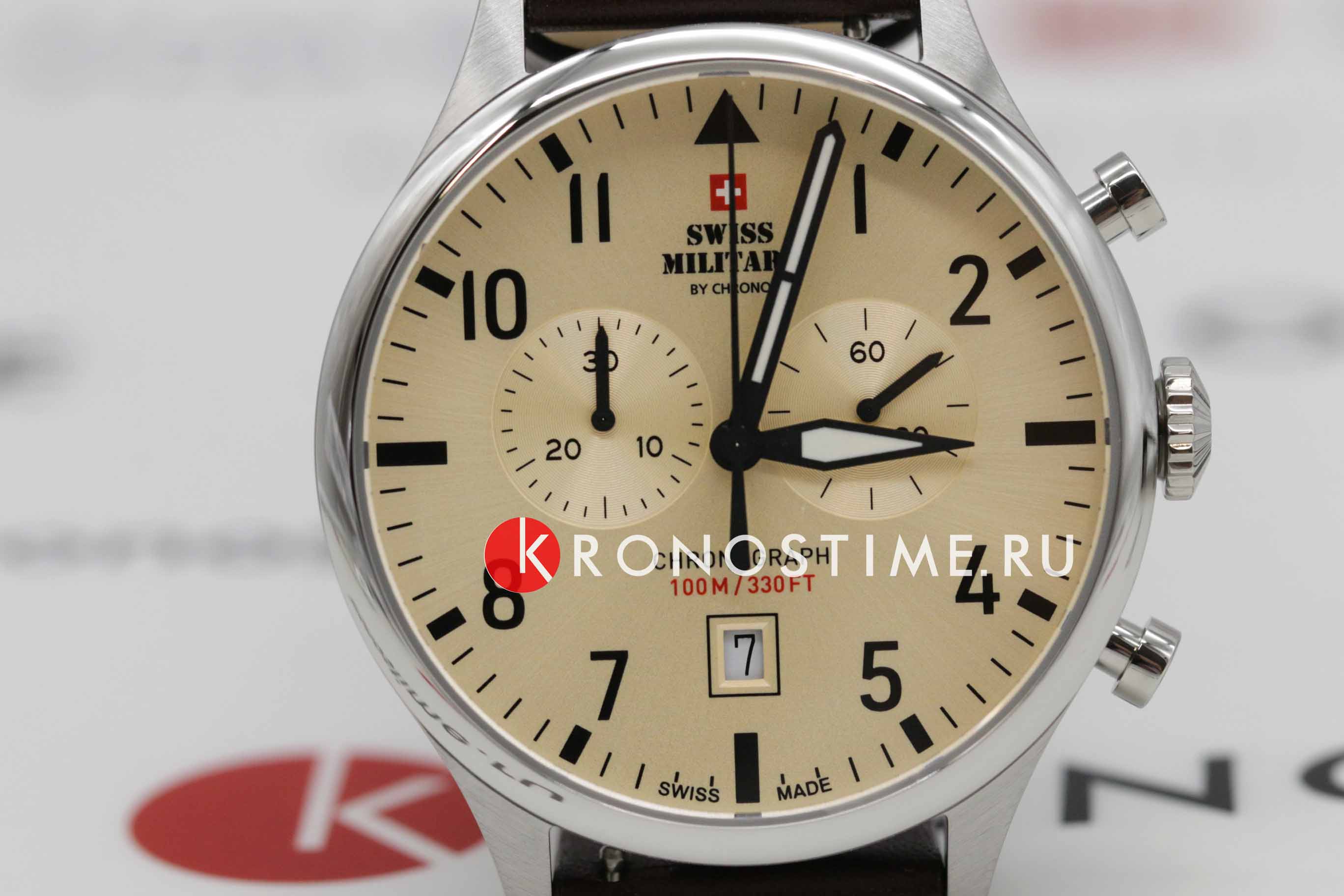 Мужские швейцарские часы хронографХронографФункция позволяет измерять отрезки времени с особой точностью: часы, минуты, секунды. Верным признаком хронографа является наличие на циферблате 3 дополнительных окошек-счётчиков. с секундомеромСекундомерСекундоме́р — прибор, способный измерять интервалы времени с точностью до долей секунды. Swiss Military by Chrono Vintage Chronograph SM34098.09, кварцевый механизм с высокой точностью. Cапфировое стеклоСапфировое стеклоПрочный и надёжный материал из кристалла сапфира синтетического происхождения, характеризующийся особой твёрдостью и устойчивостью к царапинам и повреждениям. устойчивое к появлению царапин и обладающее высокой прозрачностью. Корпус часов изготовлен из нержавеющей стали. На циферблате расположены два дополнительных индикатора и окошко даты. Окошко даты находится в положении 6 часов. Стрелки с люминесцентным покрытиемЛюминесцентное покрытиеПозволяет считывать показания времени в темноте. Производители наносят на стрелки, часовые индексы, безель или поверхность циферблата светонакопительный состав, дающий холодное свечение.. Класс водозащиты: 100 метров, позволит плавать, нырять и заниматься другими водными видами спорта. Кожаный ремешок на стандартной застежке.