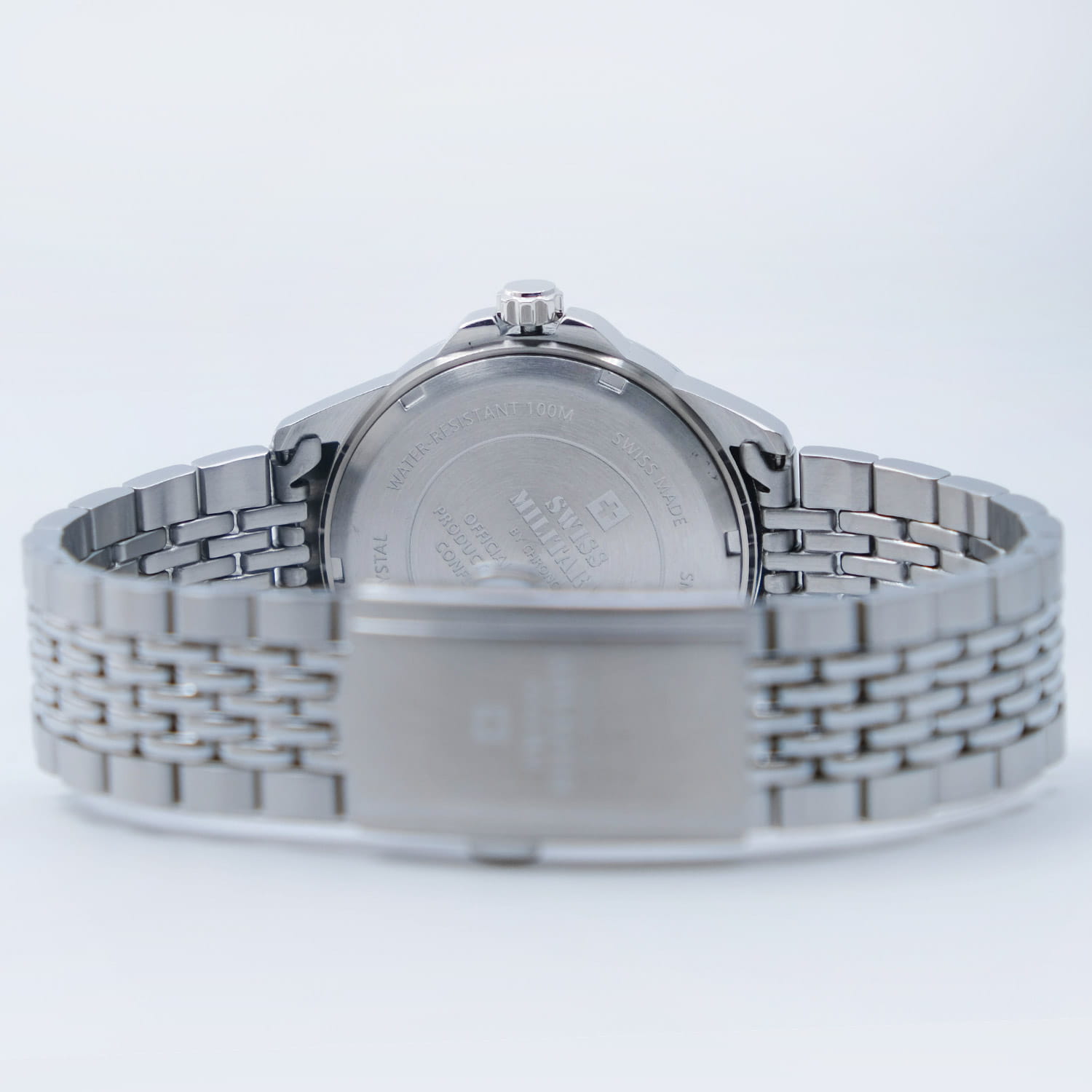 Часы Swiss Military by Chrono Classic SM34104.03 — это элегантный мужской аксессуар, сочетающий швейцарское качество и классический дизайн. Корпус диаметром 40 мм и браслет выполнены из нержавеющей стали, придающим изделию изысканный вид. Циферблат с часовыми индексами в виде штрихов и стрелками, защищёнными прочным сапфировым стекломСапфировое стеклоПрочный и надёжный материал из кристалла сапфира синтетического происхождения, характеризующийся особой твёрдостью и устойчивостью к царапинам и повреждениям., устойчивым к царапинам. Стрелки и часовые метки покрыты люминесцентным составомЛюминесцентное покрытиеПозволяет считывать показания времени в темноте. Производители наносят на стрелки, часовые индексы, безель или поверхность циферблата светонакопительный состав, дающий холодное свечение., обеспечивая отличную читаемость в условиях низкой освещённости. Модель оснащена швейцарским кварцевым механизмом, гарантирующим высокую точность хода. Окно даты расположено на позиции 3 часов, добавляя практичности в повседневном использовании. Браслет из нержавеющей стали с раскладной застёжкойРаскладная застёжкаТакой тип застёжки используется только на браслетах из металла. Она никогда не раскрывается полностью, происходит разделение на 2 и более частей. Раскладывающая застёжка снизит вероятность потери часов к минимуму. обеспечивает комфортное ношение и надёжную фиксацию на запястье. Водонепроницаемость до 10 ATM позволяет использовать часы при плавании и других водных активностях. Swiss Military — это идеальный выбор для мужчин, ценящих сочетание элегантности, функциональности и швейцарского качества.