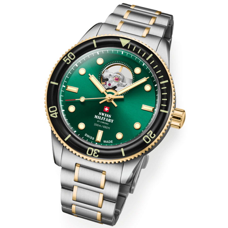 Модель SMA34106.13 от Swiss Military by Chrono сочетает профессиональные характеристики дайверских часов с классическим швейцарским качеством. Корпус и браслет выполнены из нержавеющей стали. Циферблат с метками, покрытыми люминесцентным покрытиемЛюминесцентное покрытиеПозволяет считывать показания времени в темноте. Производители наносят на стрелки, часовые индексы, безель или поверхность циферблата светонакопительный состав, дающий холодное свечение., обеспечивает отличную читаемость в темноте. Механизм с автоматическим подзаводом обеспечивает стабильную работу с запасом хода до 38 часов. Циферблат защищён сапфировым стекломСапфировое стеклоПрочный и надёжный материал из кристалла сапфира синтетического происхождения, характеризующийся особой твёрдостью и устойчивостью к царапинам и повреждениям. с антибликовым покрытиемАнтибликовое покрытиеСлой оксида металла в 0,13-0,3 микрон, благодаря которому стекло часов не бликует и не отражает свет. Антибликовое покрытие уменьшает отражение света в 10 раз, обеспечивая отличную читаемость показателей циферблата.. Браслет с с PVD-покрытиемPVDУльтратонкое покрытие наносится в технике вакуумного напыления, сочетает в себе нитрид титана особой прочности со слоем золота или оксида хрома. Несёт в себе декоративную или защитную функцию. и установлена раскладная застёжкаРаскладная застёжкаТакой тип застёжки используется только на браслетах из металла. Она никогда не раскрывается полностью, происходит разделение на 2 и более частей. Раскладывающая застёжка снизит вероятность потери часов к минимуму. для надёжной фиксации. Односторонний вращающийся безель с PVD-покрытиемPVDУльтратонкое покрытие наносится в технике вакуумного напыления, сочетает в себе нитрид титана особой прочности со слоем золота или оксида хрома. Несёт в себе декоративную или защитную функцию. позволяет точно отслеживать время погружения. Водонепроницаемость до 200 метров делает модель подходящей для дайвинга.