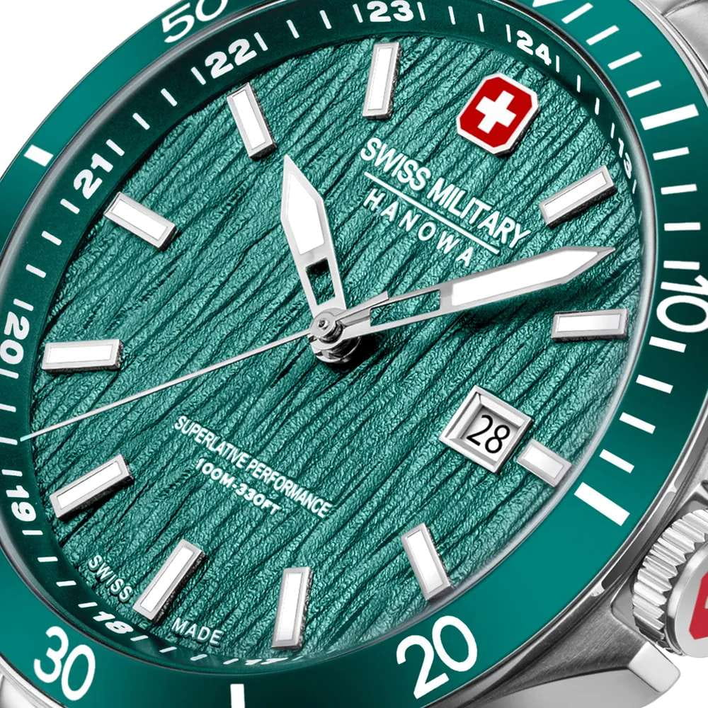 Мужские кварцевые часы Swiss Military Hanowa — швейцарская надёжность в классическом исполнении. Корпус круглый, из нержавеющей стали, диаметром 42 мм. Циферблат — зелёный с серебристыми стрелками. Стекло — сапфировоеСапфировое стеклоПрочный и надёжный материал из кристалла сапфира синтетического происхождения, характеризующийся особой твёрдостью и устойчивостью к царапинам и повреждениям.. Механизм — швейцарский кварцевый Ronda 505 с функцией (остановка секундной стрелки для точной настройки). БезельБезельВнешний ободок, закрепляющий стекло. В спортивных часах так называется поворотное кольцо с делениями на циферблате, выполняет роль таймера – замеряет отрезки времени на шкале. Неподвижный безель – элемент декора. Однонаправленно вращающийся безель на дайверских часах позволяет фиксировать моменты погружения и выныривания на поверхность. — неподвижный, из нержавеющей стали с IP-покрытиемIP-покрытиеМетод ионного напыления. Демонстрирует повышенную устойчивость к истиранию, окислению и химическим веществам. Под воздействием высокого давления и температуры около 1500°C молекулы металла надёжно соединяются с частицами корпуса часов.. Задняя крышка — завинчивающаяся. Водонепроницаемость 100 м. Браслет — стальной, на раскладной застёжке с кнопками и фиксаторомРаскладная застёжкаТакой тип застёжки используется только на браслетах из металла. Она никогда не раскрывается полностью, происходит разделение на 2 и более частей. Раскладывающая застёжка снизит вероятность потери часов к минимуму.. Идеальный выбор для тех, кто ценит швейцарское качество и классический стиль.